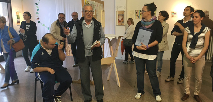 “La scrittura per Alessandro non è stata solo un modo per iniziare a comunicare, ma è stata effettivamente una cura che lo ha portato a stare bene, fisicamente, a livello relazionale, nella quotidianità della vita al centro -ha spiegato Roberta Sirtori, educatrice della Cooperativa Il sorriso e curatrice dell’esposizione insieme a Virna Tremolada, anche lei educatrice del centro- Questa esposizione non è un voler spiegare semplicemente il contenuto del libro, che è di per sé immediato, abbiamo pensato invece di prendere singoli capitoli e lavorarli con gli altri utenti della Cooperativa, che in base alle proprie capacità e peculiarità, hanno contribuito alla realizzazione di queste installazioni, prendendo una parola, un concetto, e dandone la propria visione. E’ un progetto un po’ ambizioso e alto, per uscire da quello schema secondo cui la disabilità si ferma alla possibilità di fare disegnini o lavoretti“.