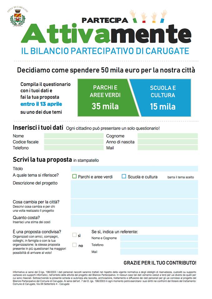 Ogni cittadino compilando un questionario potrà proporre entro il 13 aprile un’idea su uno dei due temi proposti. Descriverà il progetto, indicherà quali benefici questo apporterà a Carugate e indicativamente quanto costerà realizzarlo.