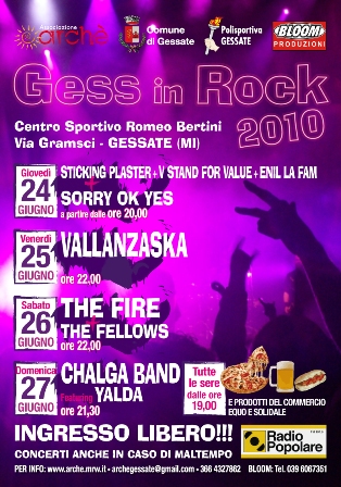 La kermesse si svolgerà all’interno del centro sportivo di via Gramsci. Oltre alla musica, tutte le sere, dalle 19, saranno presenti stand e prodotti del mercato equo e solidale. Per dettagli sulla manifestazione, visitare il link: http://www.comune.gessate.mi.it/ev/images/GessInRock2010_website.jpg.