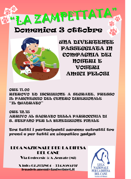 Una giornata in compagnia degli amici a quattro zampe. La sezione segratese della Lega Nazionale per la difesa del Cane organizza La Zampettata. Appuntamento domenica 3 ottobre, alle 11, nel parcheggio del Centro Direzionale Il Quadrato. Dopo l’iscrizione, i partecipanti partiranno poi alla volta della parrocchia di Santo Stefano, dove alle 12.15 è prevista la benedizione. Tra tutti i partecipanti, verranno estratti due vincitori che si aggiudicheranno dei simpatici premi, mentre a tutti saranno distribuiti gadget da parte della Lega.