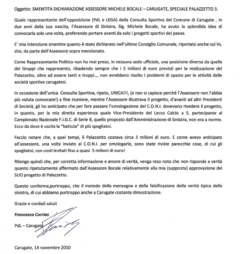Come rappresentante politico non ho mai preso, in nessuna sede ufficiale, una posizione diversa da quella dei gruppi che rappresento (Pdl e Lega), ribadendo sempre che i 5 milioni di euro previsti per la realizzazione del palazzetto, oltre ad essere tanti e troppi…, non avrebbero risolto ii problemi di spazio per le attività delle società sportive carugatesi.