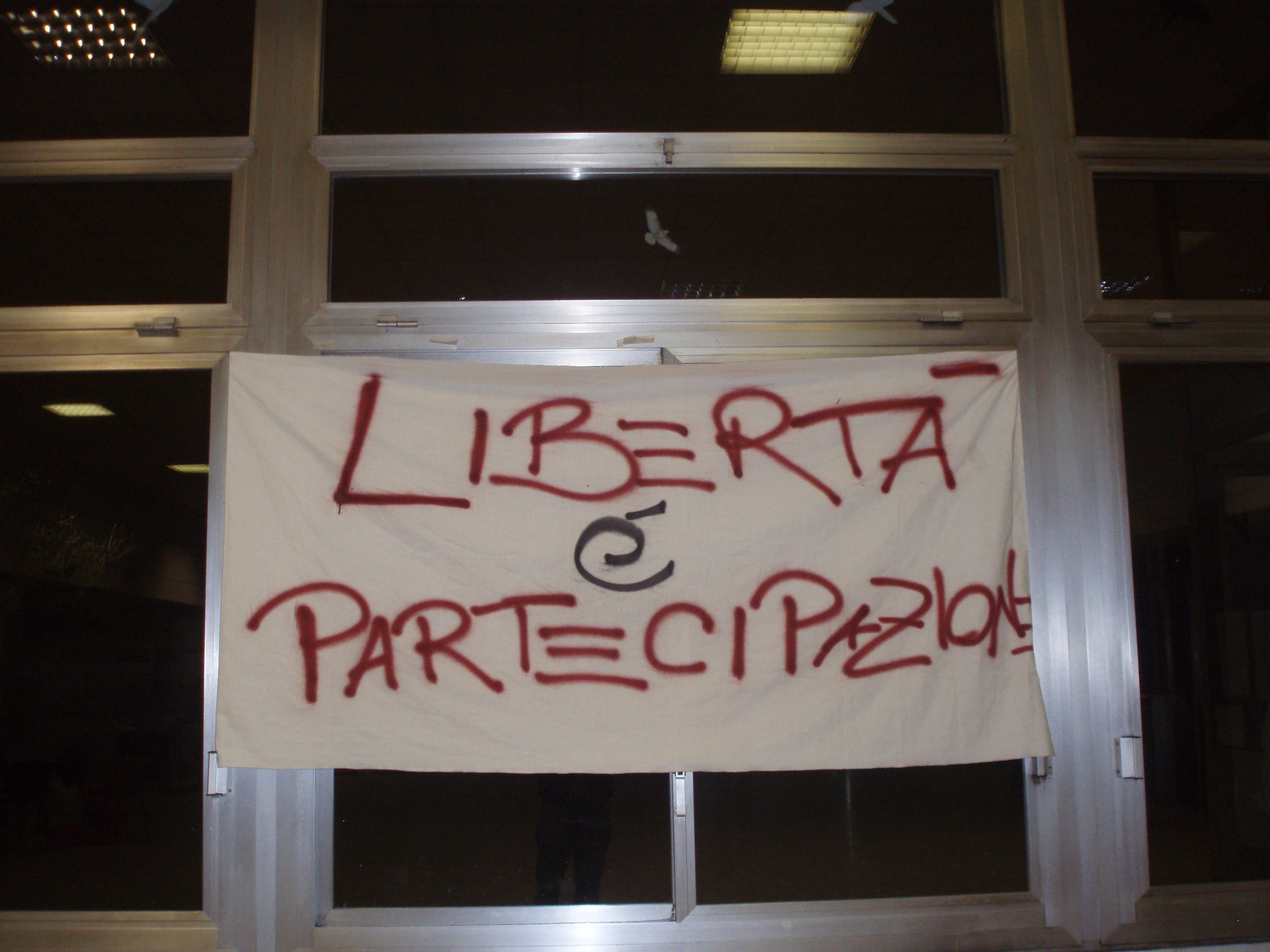 Se è possibile la moderazione in questo caso ha giocato di sponda all’informazione scolastica, perché sempre come mi spiegano i ragazzi, solo grazie alla collaborazione del professor Mazzi, esterno all’istituto, e simpatizzante della causa degli studenti, è stato possibile creare gruppi estremamente formativi. Dopo non molto, ecco spuntare dalla scuola due dei ragazzi che campeggiavano all’interno dell’istituto, Davide e Fabio, che mi spiegano che il loro gesto vuole enfatizzare la loro volontà di protestare contro un legge, a dir loro, non accettabile; mi mostrano uno degli slogan esposti durante le giornate appena trascorse, “libertà è partecipazione”, che, tratto dall’omonima canzone di Giorgio Gaber, esprime in sintesi l’anima dell’autogestione appena passata. Non sono ancora sicuri di cosa faranno la mattina dopo ma la notte sarà nell’atrio della scuola.