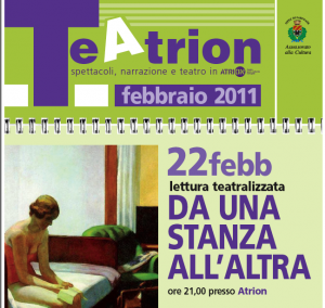 Tre appuntamenti per gli amanti della letteratura ma anche del teatro. Prende il via questa sera (martedì 22 febbraio) la rassegna “TeAtrion”, organizzata dall’assessorato alla Cultura di Carugate, il cui nome gioca ovviamente con quello del luogo in cui pulsa il cuore culturale della città, ovvero il Centro Socio Culturale Atrion. Nelle tre serate in programma si potrà assistere ad altrettante letture teatralizzate. La prima, in programma per questa sera, sarà “Da una stanza all’altra”, un viaggio nella letteratura femminile del ‘900, con Elisabetta Vergani e al pianoforte Filippo Fanò, a cura di Emisfero Destro Teatro di Cassina de Pecchi.
