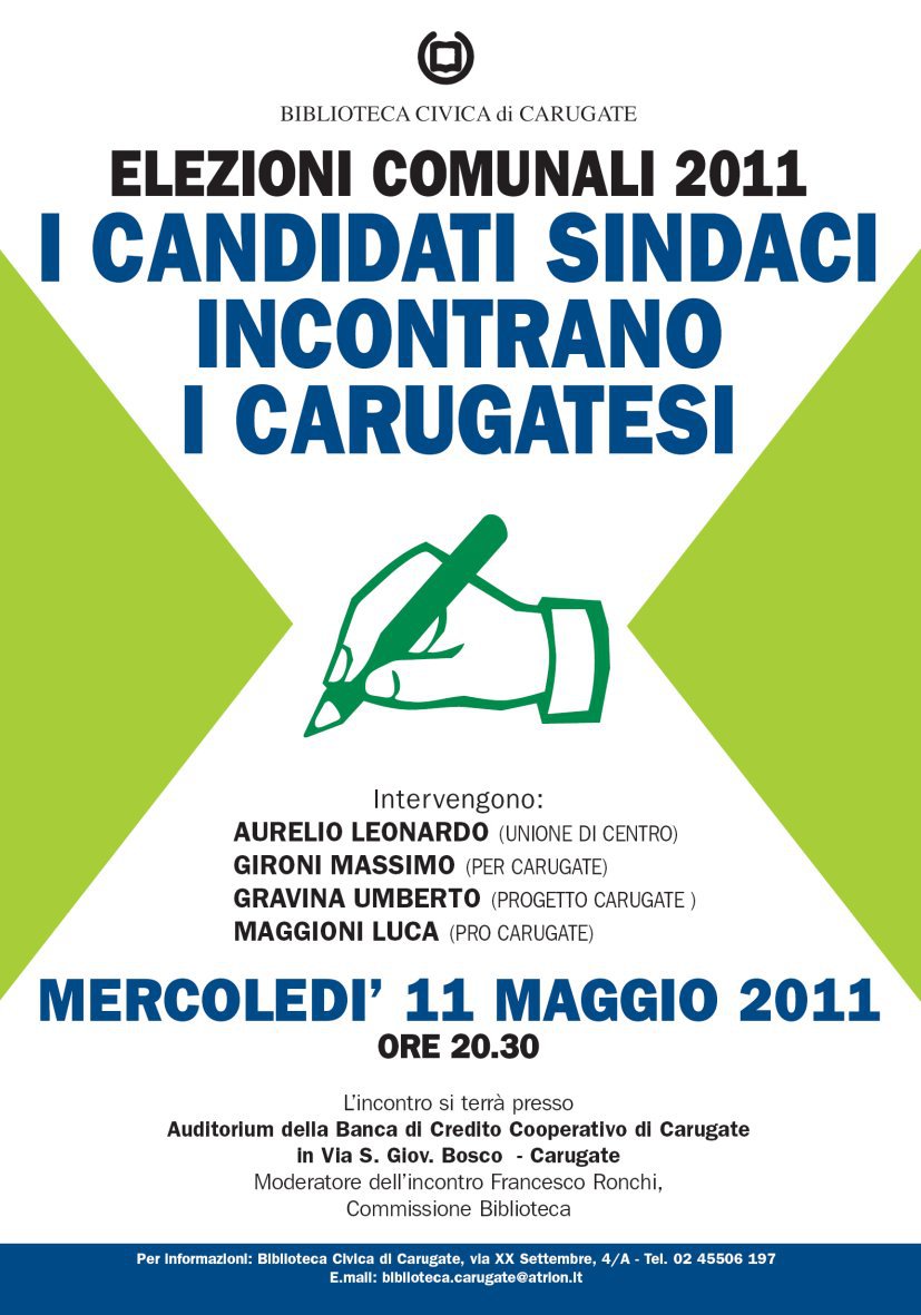 Faccia a faccia tra i candidati alle Elezioni Amministrative del 15 e 16 maggio a Carugate. I quattro aspiranti sindaco si confronteranno in una serata organizzata dalla Biblioteca Civica di Carugate e moderata da Francesco Ronchi, membro della Commissione Biblioteca.