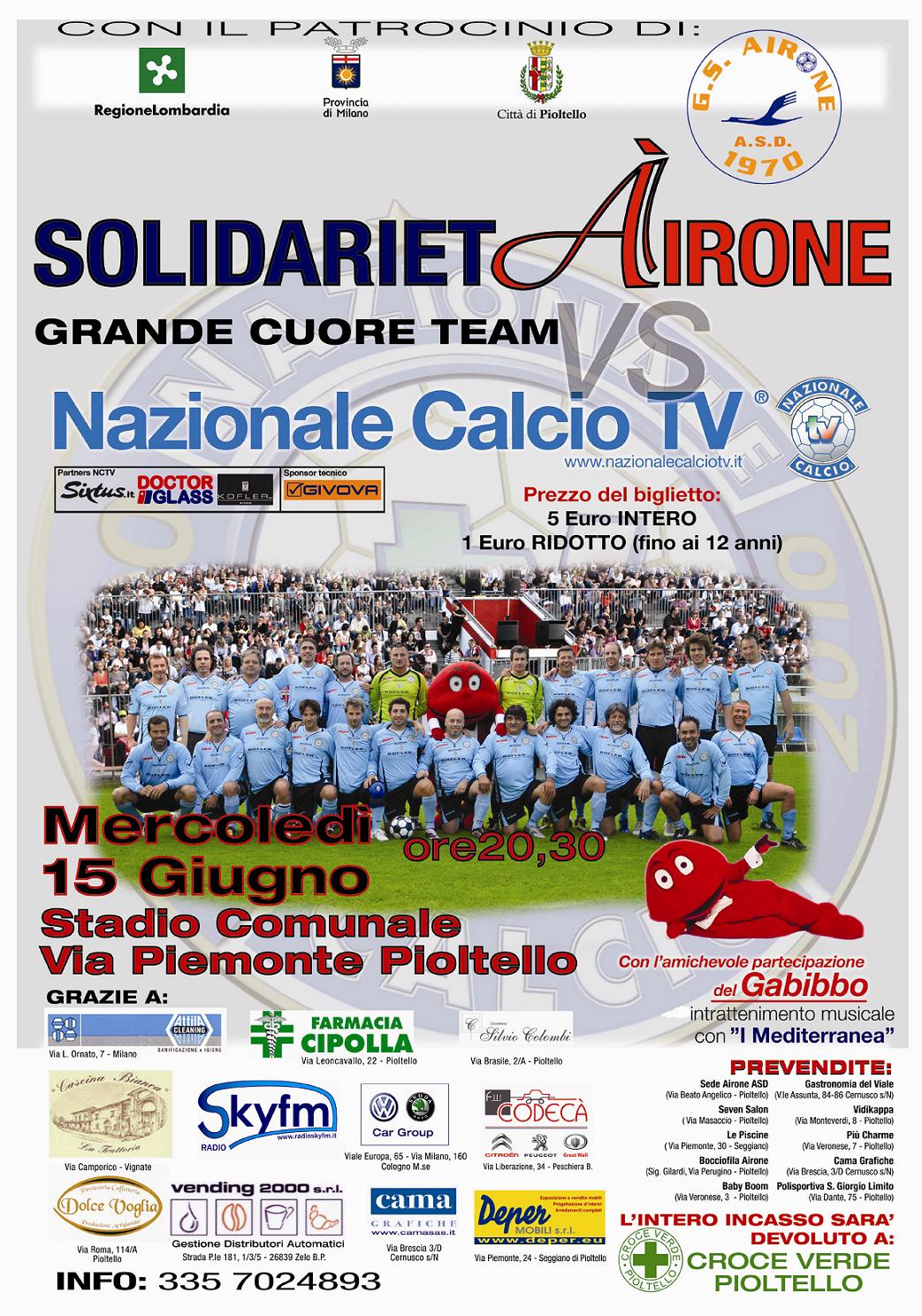Una serata di sport e solidarietà si terrà mercoledì 15 giugno a Pioltello. La Nazionale Calcio Tv scende in campo per una Partita del Cuore, il cui ricavato verrà devoluto alla Croce Verde. A sfidare le grandi glorie del calcio ci sarà una formazione locale, il Grande cuore Team, in una serata dal titolo “Solidarietà Airone”.