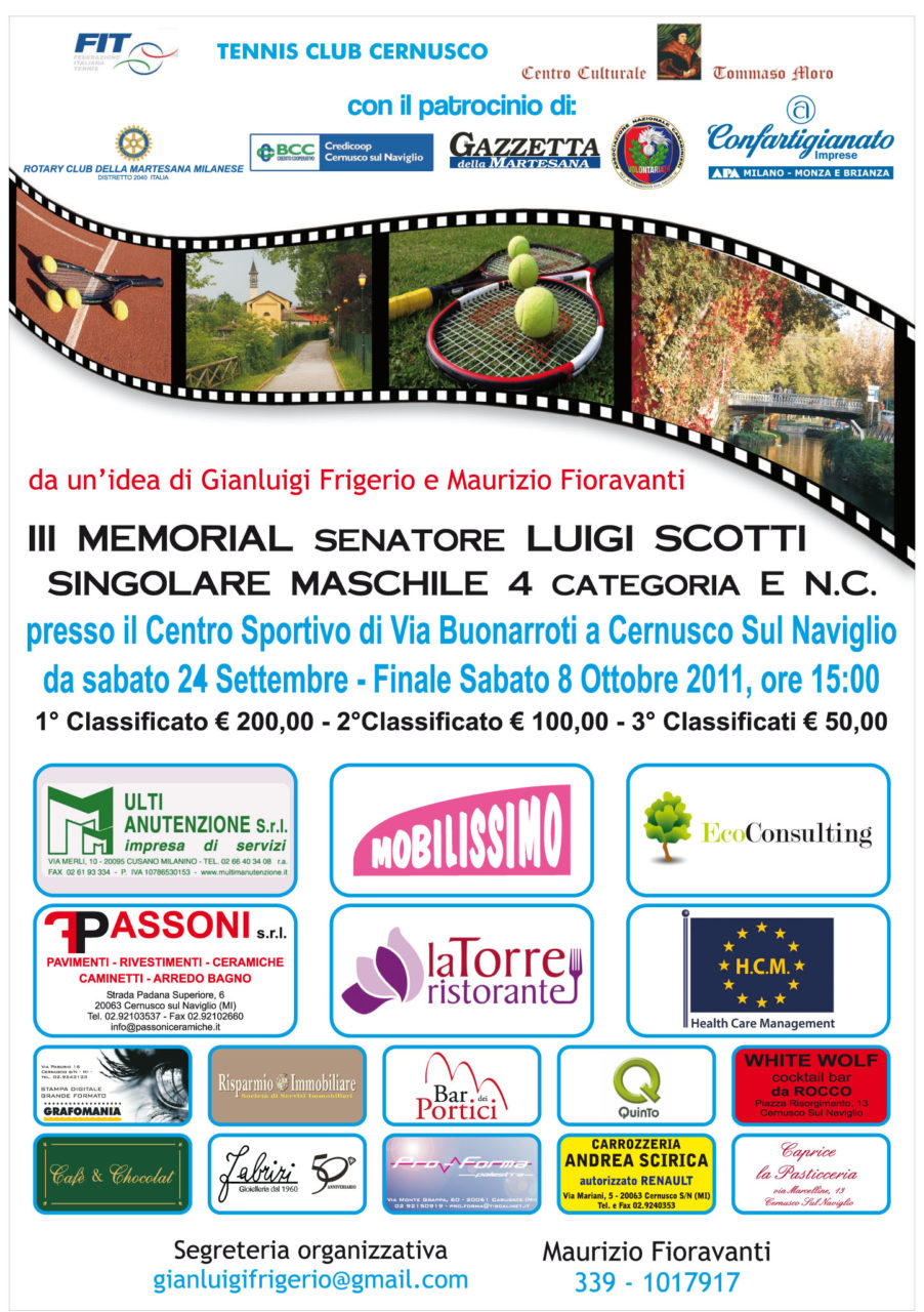 Fa il pieno di iscritti il terzo torneo di tennis dedicato al Senatore Luigi Scotti organizzato da Gianlugi Frigerio e Maurizio Fioravanti.