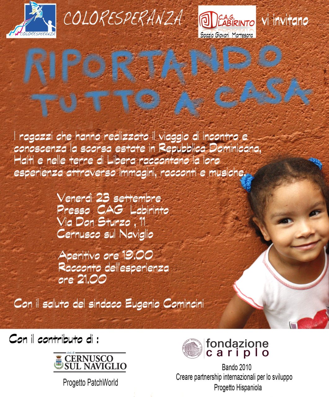 L’iniziativa organizzata da “Coloresperanza” in collaborazione con il cag “labirinto” prevede infatti un aperitivo dalle ore 19.oo a cui seguirà il racconto dei ragazzi accompagnato dalle chitarre classiche di Elisa Bianchi e Marta Ferroni.