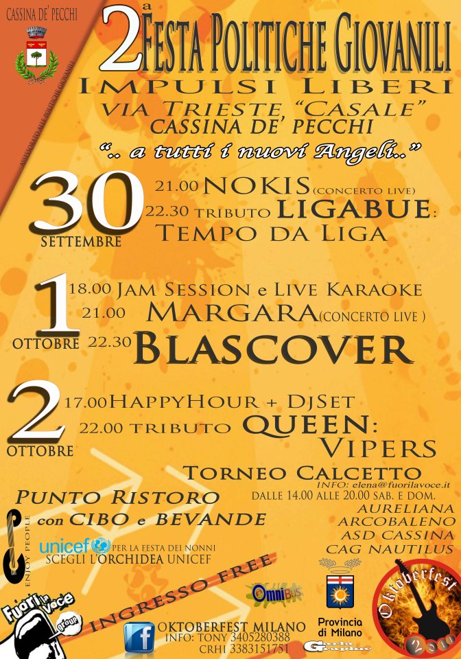 Sabato sarà la volta del grande Vasco. La “Blascoverband” si esibirà sul palco della seconda “festa delle politiche giovanili -Impulsi liberi” per ripercorrere i grandi successi della rockstar di Zocca per concludere con un tributo ai “Queen” a cura dei “Vipers” domenica 2 Ottobre