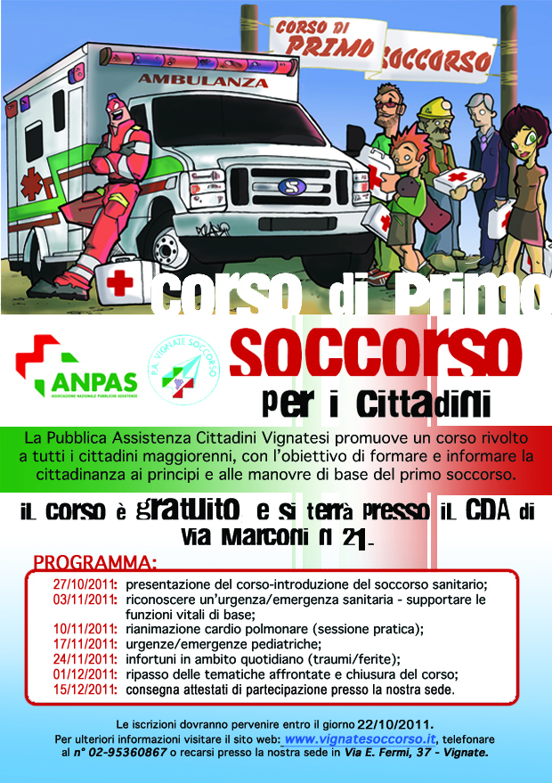 Dopo l’iscrizione, che dovrà pervenire entro sabato, dal 27 ottobre inizieranno le lezioni per un totale di 7 inconri, fino al 15 dicembre. Per chi fosse interessato e volesse partecipare, puo visitare il sito www.vignatesoccorso.it, telefonare allo 02/95360867 o recarsi direttamente presso la sede dell’Anpas in via Fermi,37 a Vignate