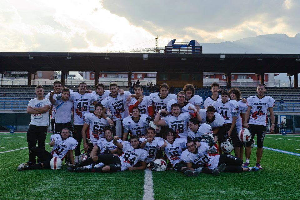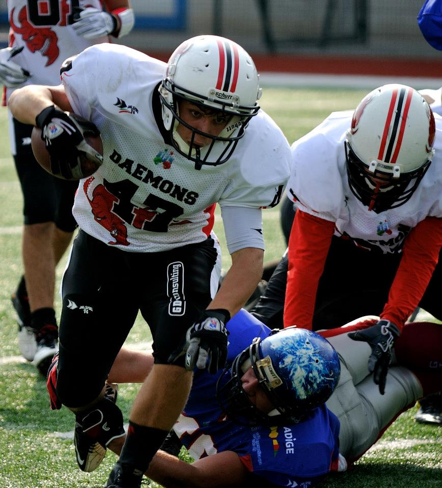 Una partita vera quella a cui ha assistito il pubblico dello Stadio Europa di Bolzano, ad oggi l’unica struttura sportiva comprendente uno stadio creato appositamente per il gioco del football americano , che ha visto i giovani demoni combattere duramente fino alla fine, nonostante due mete subite nei primi minuti di gioco (6 punti l’una più un’azione di gioco supplementare da 1 o 2 punti definita extra point), abilmente recuperate grazie al passaggio del Quarterback Mondin sul Running Back Loglisci che con una corsa (manco a dirlo) indiavolata ha portato i Daemons in vantaggio per 12-13. Nell’ultimo e decisivo quarto di gioco, con entrambe le formazioni molto provate, una giocata trucco di Coach Tisma porta definitivamente i ragazzi di Bolzano sul 20-13 chiudendo la partita.