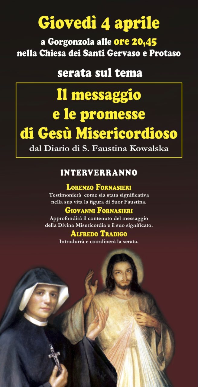 Durante l’incontro si potranno ascoltare alcuni brani tratti dall’Audiolibro del Diario completo di Suor Faustina, proposto dalla Casa-Editrice Mimep-Docete di Pessano con Bornago , e le musiche del Maestro Filippo Bentivoglio.