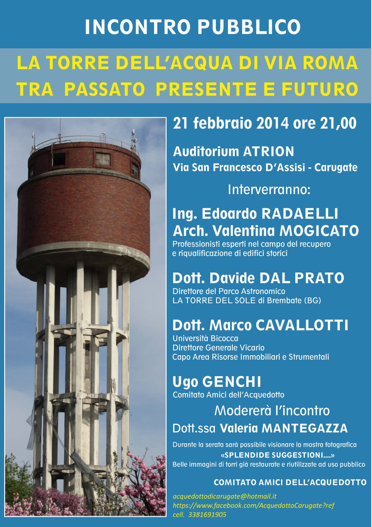 Nel 2012 s’inizia a parlare in paese di abbattimento della Torre dell’ acqua, perché non più funzionante e in condizioni strutturali precarie. Alcuni cittadini si auto organizzano e smuovono l’opinione pubblica per fare in modo che un pezzo di “memoria storica” venga preservata. Partono lettere all’Amministrazione comunale, a CAP Holding (gestore dell’acquedotto) e alla Sovrintendenza dei Beni Culturali. Il Comitato si informa su realtà simili che hanno riconvertito la struttura mettendola a disposizione dei cittadini per nuovi scopi, e prendono contatto con diverse realtà. Le pressioni esercitate dal gruppo di carugatesi ottengono gli effetti sperati e nel luglio 2012, La Sovrintendenza blocca il processo di demolizione della Torre, riconosciuta Ministero per i Beni e le Attività Culturali come bene storico soggetto alla tutela della legge, e impone all’azienda responsabile la messa in sicurezza della struttura, avvenuta a settembre 2013.