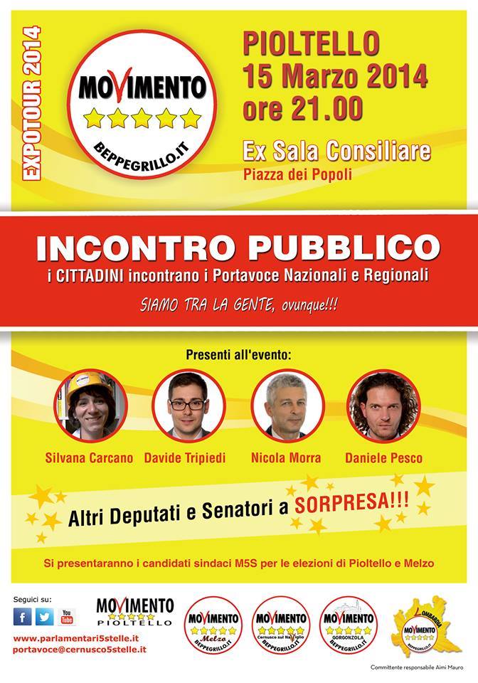 Sabato 15 marzo alle ore 21.00 nella ex sala consiliare di Pioltello in Piazza dei Popoli, gli esponenti nazionali e regionali del Movimento, incontreranno i cittadini per presentare i candidati sindaci di Melzo e Pioltello.