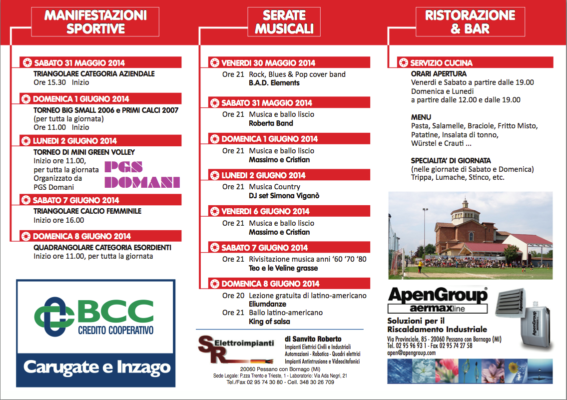 Da oggi 30 maggio sino a lunedì 2 giugno, e poi dal 6 all’ 8 giugno, gli spazi sportivi di Via Kennedy 10 si trasformeranno di giorno in un grande ritrovo di sportivi, e di sera in una grande balera con musica per tutti i giusti. Per i dettagli completi ddi giorni e orari, scaricare la locandina (scarica qui).