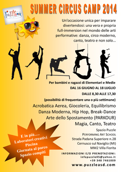Le porte dello “Spazio Puzzle Performing Art School” (Strada Padana Superiore, 28 Cernusco sul Naviglio, stazione metropolitana di Villa fiorita), si sono aperte già da questa settimana per i bambini dai 7 ai 14 anni, che “avranno la possibilità fino all’11 Luglio – sottolineano Silvia Vetralla, Direttrice Artistica e Francesco Mariotti, Direttore tecnico della scuola – di mettersi alla prova lavorando su se stessi per migliorarsi e utilizzare il proprio corpo come mezzo principale di espressione, in maniera non competitiva e in un contesto creativo, divertente, ma allo stesso tempo fatto di regole e sotto l’occhio attento di personale qualificato, composto da uno staff tecnico e da assistenti ed esperti”.