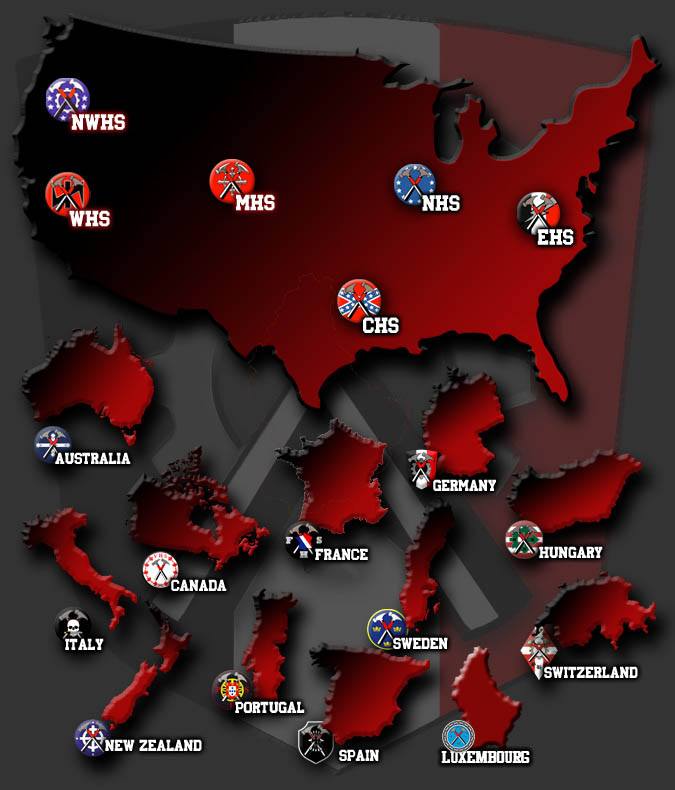Qui sotto un’immagine comparsa sul sito americano di Hammerskin, che rivendica la sede centrale dell’organizzazione, e le sedi satellite nel resto del mondo.