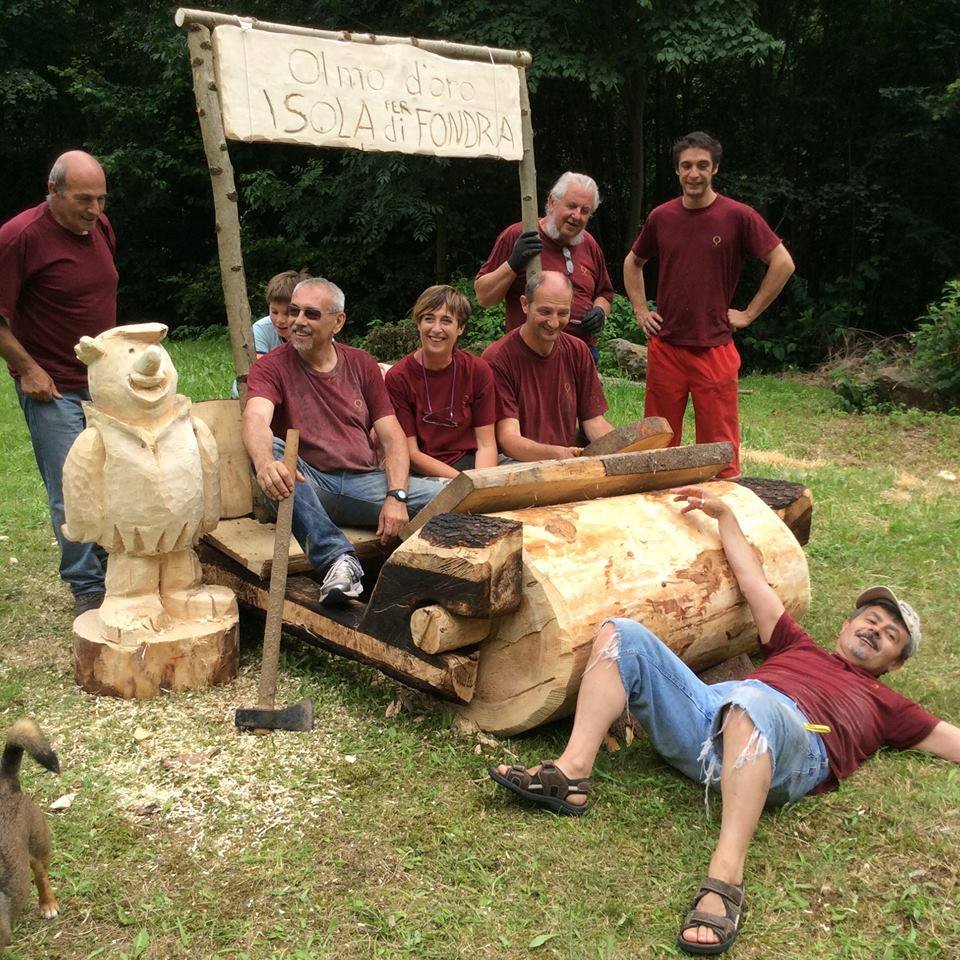 In questi ultimi giorni di metà luglio, dall’ 11 al 13, l’associazione ha realizzato diverse opere che andranno ad abbellire il sentiero montano che conduce al rifugio gestito da Vierin, che vanta al suo esterno molte altre realizzazioni di firma carugatese.  Per questo speciale lavoro, esteso anche ad altri importanti nomi dell’arte scultoria su legno della regione, sono saliti da Carugate a Mont Fallere in sei: Claudio Ferrarini, Presidente dell’Olmo, Luca Mafezzoli, Ivan Ronzoni, Giorgio Frizzarin, Giuseppe Piras e Renzo Cattenati, che su tema libero hanno realizzato figure differenti: un gufo in atterraggio, delle particolari sedie ricavate dal legno, e due figure contadine che sostengono un insegna (opera questa realizzata a 4 mani).