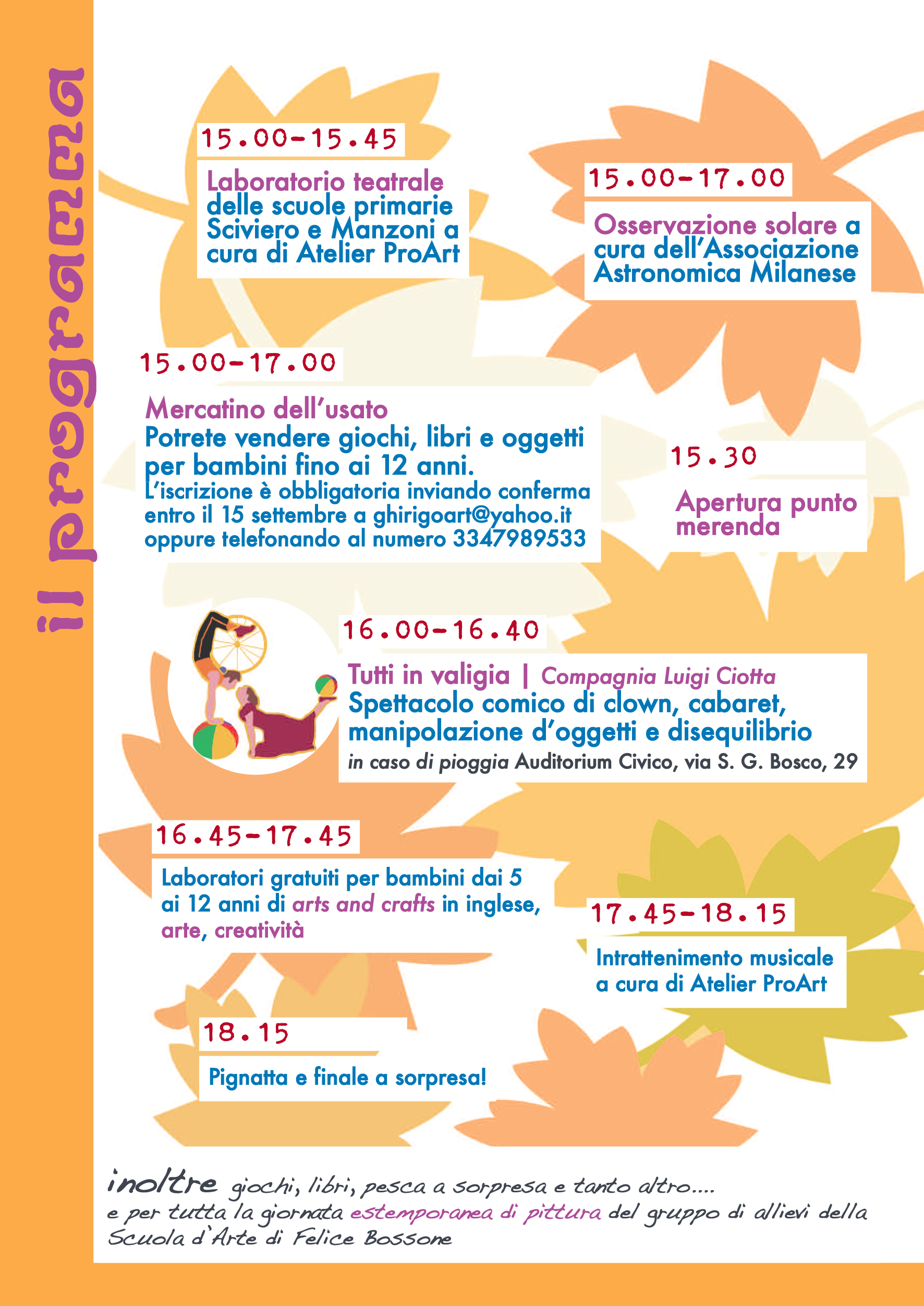 Dopo il momento della merenda alle 15.30, la “Compagni Luigi Ciotta” proporrà un divertentissimo spettacolo di clown, cabaret, manipolazione d’oggetti e disequilibrio, che promette di stupire tutto il pubblico, dai più piccoli ai più grandi.