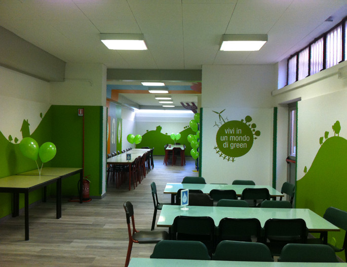 Ai nuovi spazi, caratterizzati da apparecchiature a maggiore efficienza energetica e dall’impiego di dispositivi per il contenimento degli sprechi idrici ed energetici, è stato affiancato un nuovo menu a basso impatto ambientale, capace di sfruttare la stagionalità dei cibi e la possibilità di consumazione a kilometro 0.