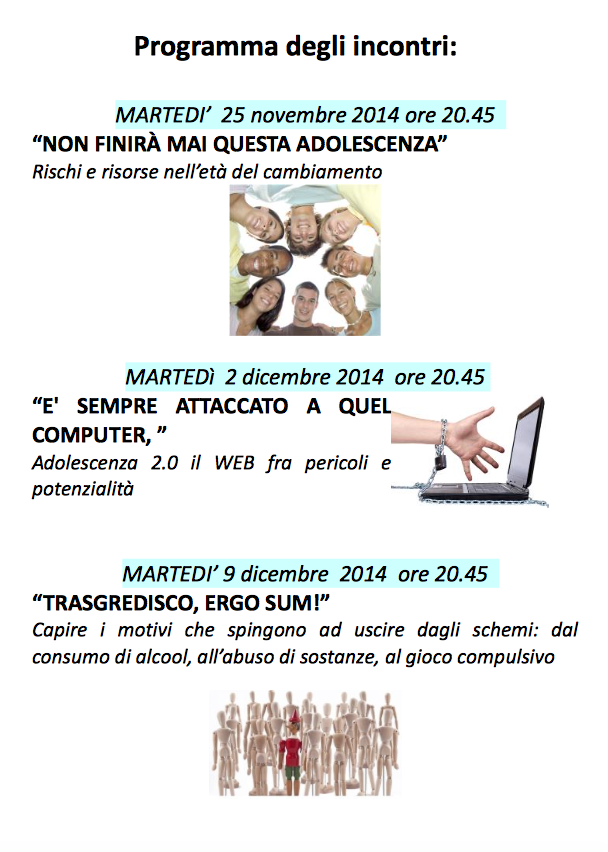 Il primo incontro, sul tema “Non finirà mai questa adolescenza. Rischi e risorse nell’età del cambiamento”, si terrà martedì 25 novembre 2014, alle ore 20.45 nella sala consiliare del comune. Per il programma degli altri incontri cliccare qui.