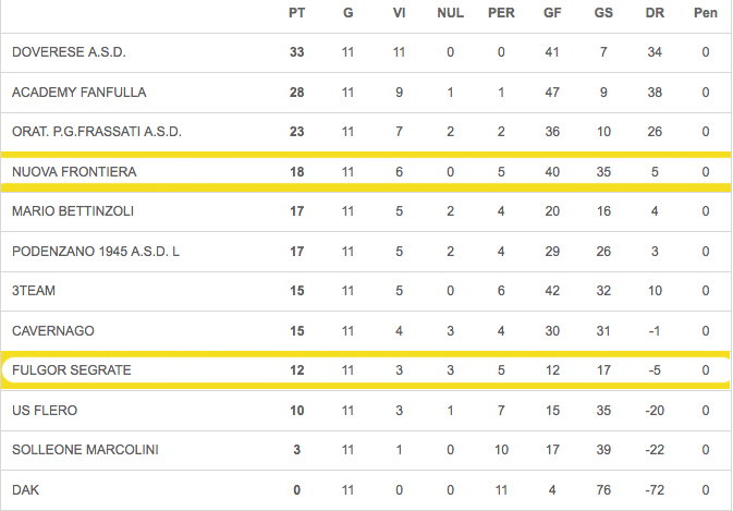 Speranza Agrate 1° posto; Don Bosco Carugate 2° posto con una partita in meno; Oratorio Bornago 6° posto.