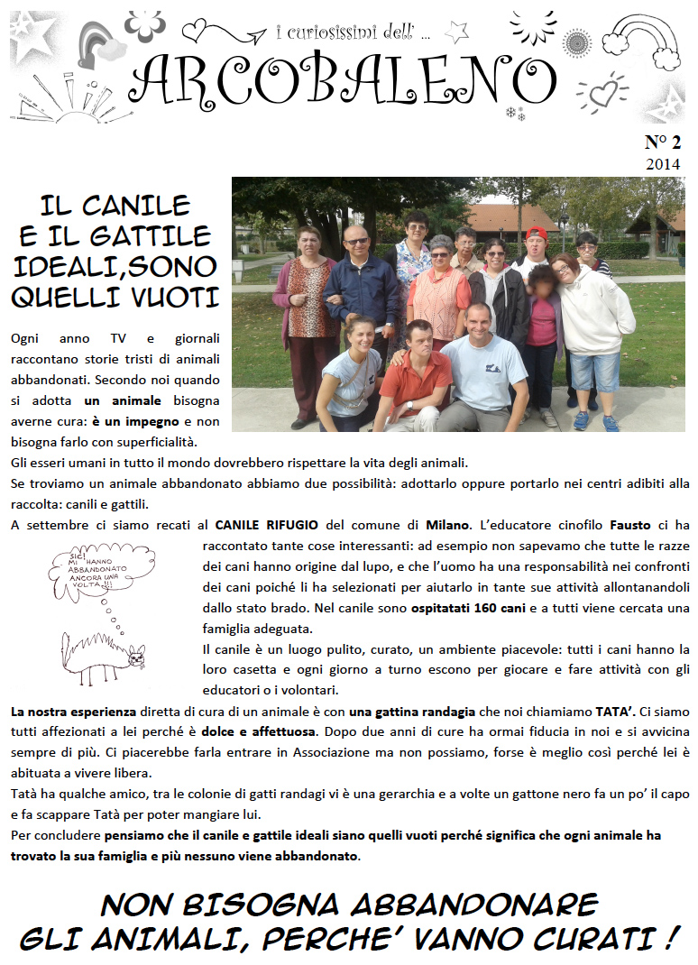 Nel numero 2 de “I Curiosissimi dell’Arcobaleno“, non sono mancati inoltre i racconti legati all’esperienza di autonomia residenziale, allo spettacolo natalizio di enorme successo tenutosi al centro per il Natale 2013, l’angolo delle ricette e la rubrica dedicata alle novità.