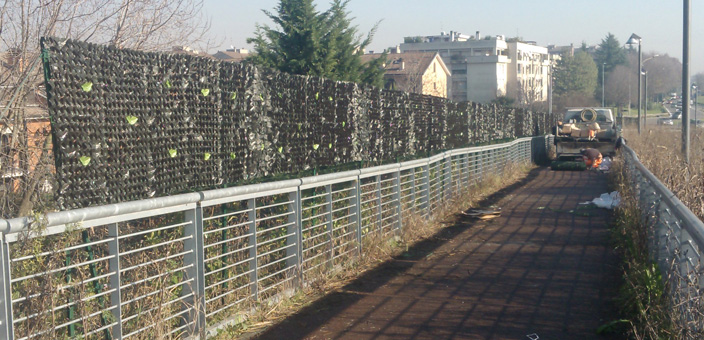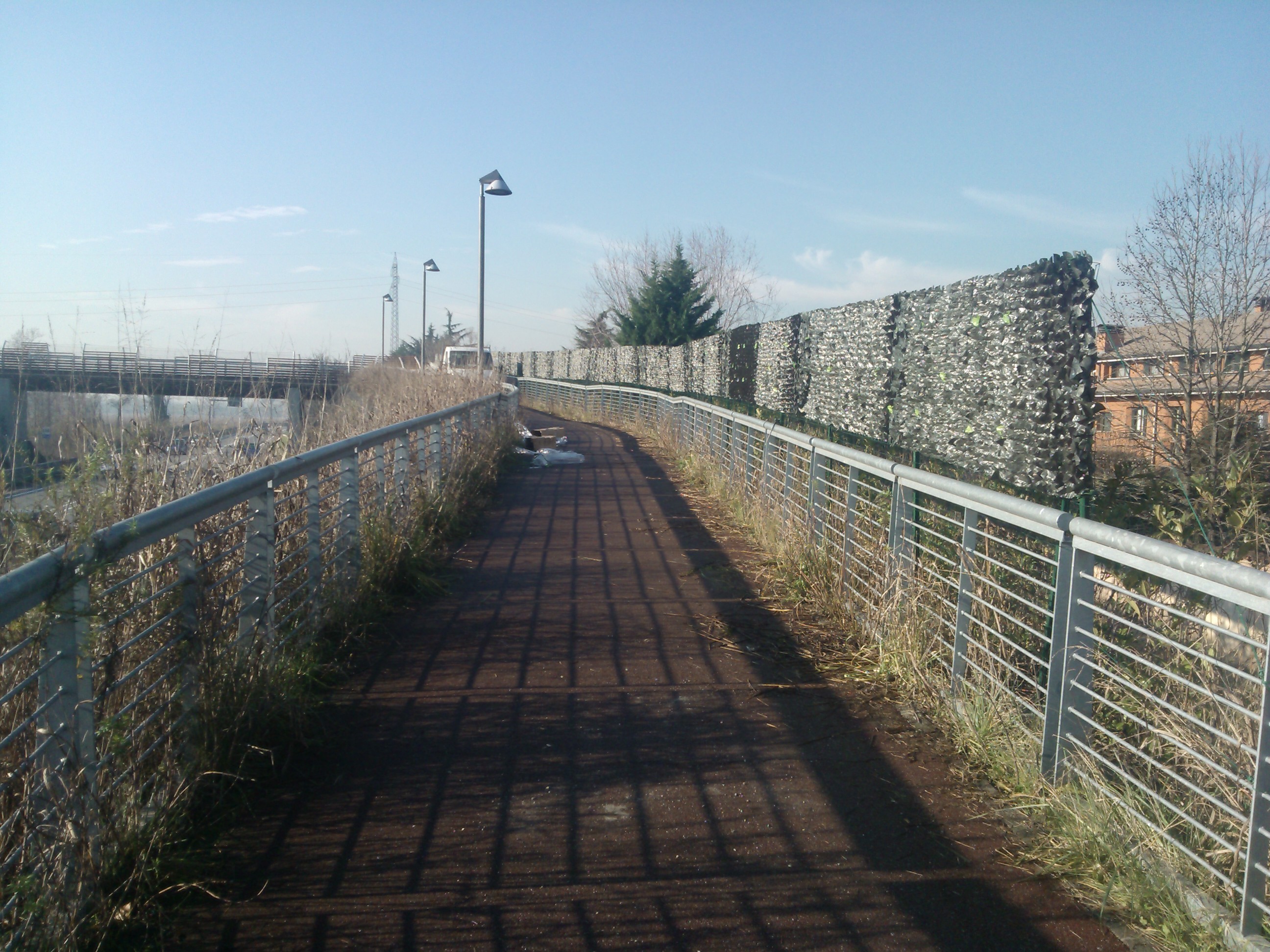 Una simil siepe che costeggia tutto il lato esterno del ponte ciclopedonale di raccordo tra Cernusco e Pioltello.