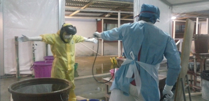 “Il lavoro cominciava alle 8.00 del mattino. All’entrata del centro c’è sempre una postazione di controllo della temperatura e poi la “change room” dove ci toglievamo i vestiti personali per indossare la divisa. Dopo di che si stabilivano i turni di assistenza nella zona rossa, dove ci sono le strutture con cui vengono assistiti i pazienti colpiti da ebola. Per arrivare alla zona rossa bisognava passare attraverso zone gialle, di passaggio, dove indossavi indumenti di protezione specifica, cioè calzari e stivali di gomma, tuta saldata e priva di cuciture che copriva dalle caviglie sino alla testa con un cappuccio, poi cuffietta e maschera, infine visiera e doppi guanti. Tutta la vestizione era controllatissima, soprattutto la ricerca di eventuali buchi nella tuta”.