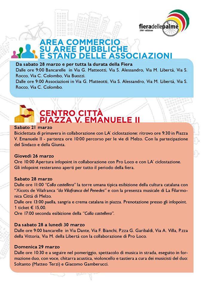 Il gemellaggio con la cittadina catalana di Vilafranca del Penedès, a 30km da Barcellona, porterà in città un tocco colorato sia per la vista che per il gusto. Sabato dalle 11.00, e poi in replica alle 17.00, in Piazza Vittorio Emanuele II infatti, gli ospiti spagnoli metteranno in scena la tipica “Colla Castellera“, torre umana tradizionale nella cultura catalana. La Filarmonica della Città di Melzo accompagnerà l’evento, e dalle 13.00 ci saranno paella, sangria e crema catalana in piazza. La prenotazione anche in questo caso è presso gli Infopoint.