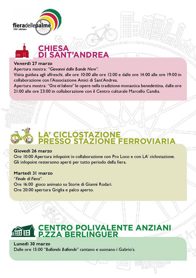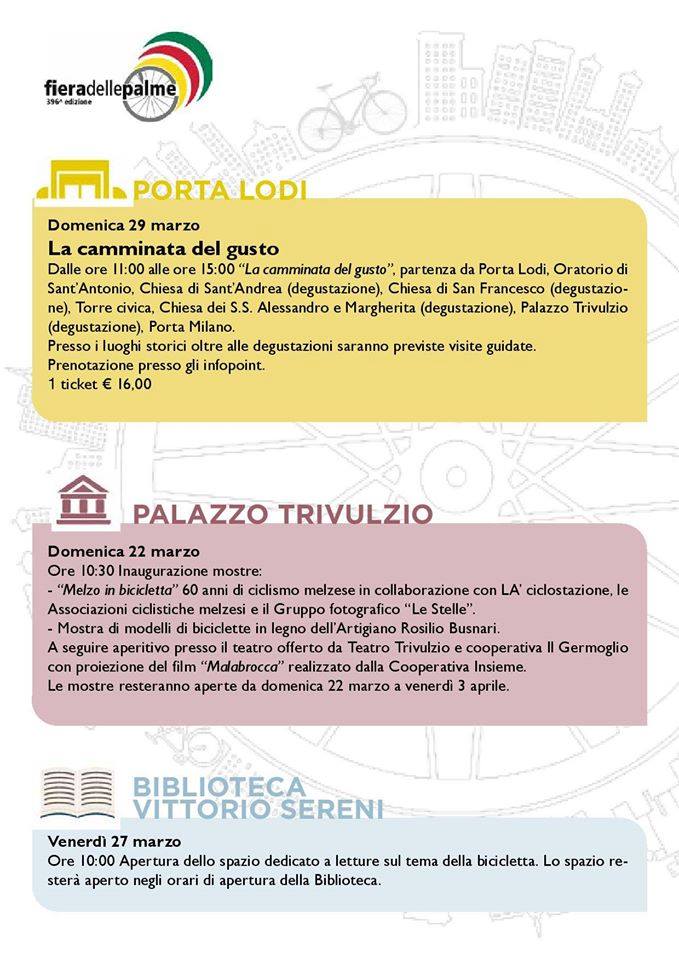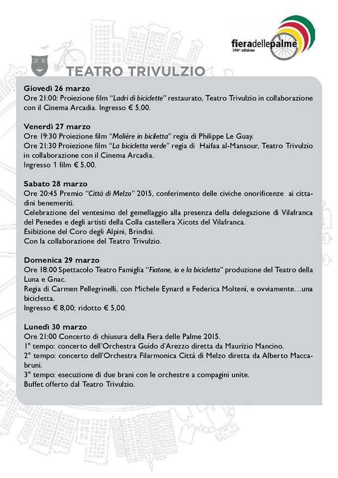 Il teatro Trivulzio proietterà tre film a tema giovedì 26 marzo (“ladri di biciclette” alle 21.00) e venerdì 27 marzo (“Moliere in Bicicletta” alle 19.30 e “La bicicletta Verde” alle 21.30), mente presso l’area fiera di Via Cardinal Colombo, domenica 29 marzo dalle 14.00 si susseguiranno un corso di educazione stradale per ciclisti metropolitani, tenuto dal Comandante ella Polizia Locale Flavio Lucio Rossio, e la presentazione del libro “L’intelligenza degli indizi. La bicicletta come esemplificazione del rapporto tra uomo e tecnologia” di Carlo Buora.