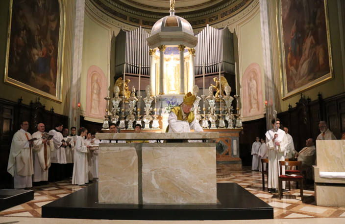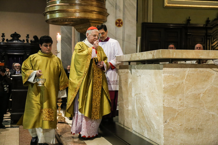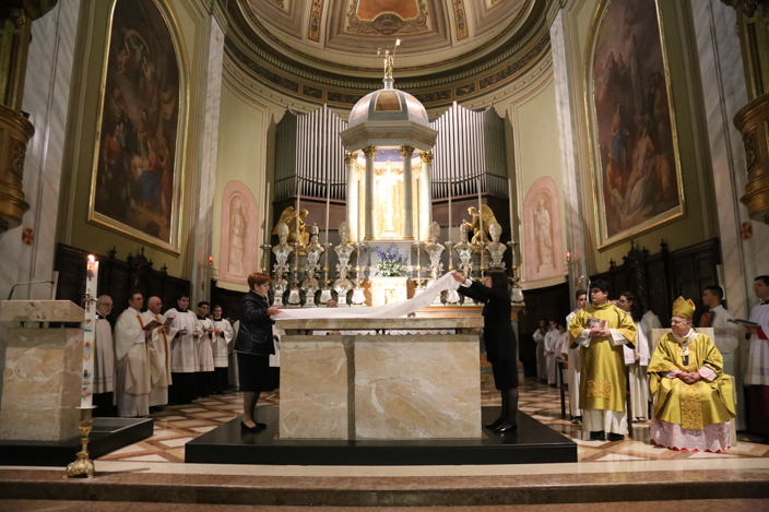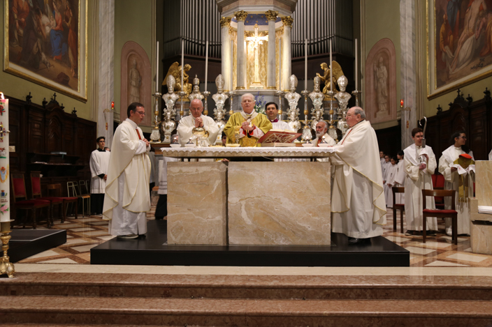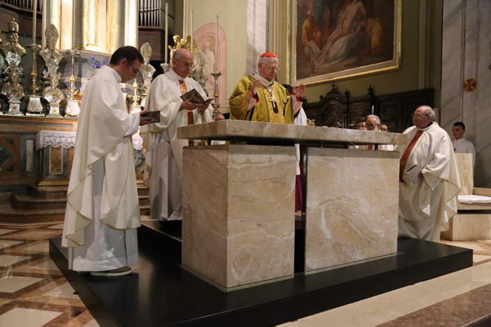Nella speciale Messa Solenne iniziata alle ore 10.00 e protrattasi sino alle 12.00, l’Arcivescovo di Milano ha mostrato ai fedeli il Lezionario, accompagnando con una preghiera di benedizione, e solo dopo la liturgia della parola, è iniziato il vero e proprio rito della dedicazione dell’altare, con la Litania ai Santi, la Preghiera di Dedicazione, il potente gesto dell’ unzione dell’altare stesso con il Sacro Crisma e poi l’incensazione dello stesso. Una simbologia di grande impatto per un evento eccezionale, che come ha ben sottolineato il Cardinale “per come è robusto questo marmo, forse solo tra secoli i vostri discendenti assisteranno ad un’altra cerimonia come questa”.