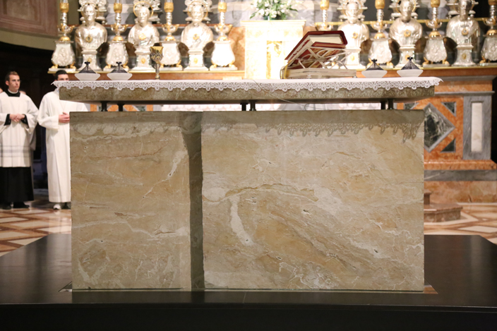 “La frattura incisa nel marmo di questo altare, indica la morte, il sacrificio di Gesù, il dono totale di sé che fa per noi e che continua a fare, lui assoluto innocente, che si carica i nostri peccati e le nostre fragilità. Ma a questo sacrificio è legata la dimensione della cena eucaristica, la volontà di Gesù, che per restare presente accanto ad ogni uomo in ogni tempo e in ogni luogo, ha trasformato il pane e il vino nel suo corpo e nel suo sangue, espressione concreta del suo donarsi a noi. E la vostra scelta architettonica concretizza nel marmo questi due aspetti, che sono il segno del gesto che stiamo per compiere“.