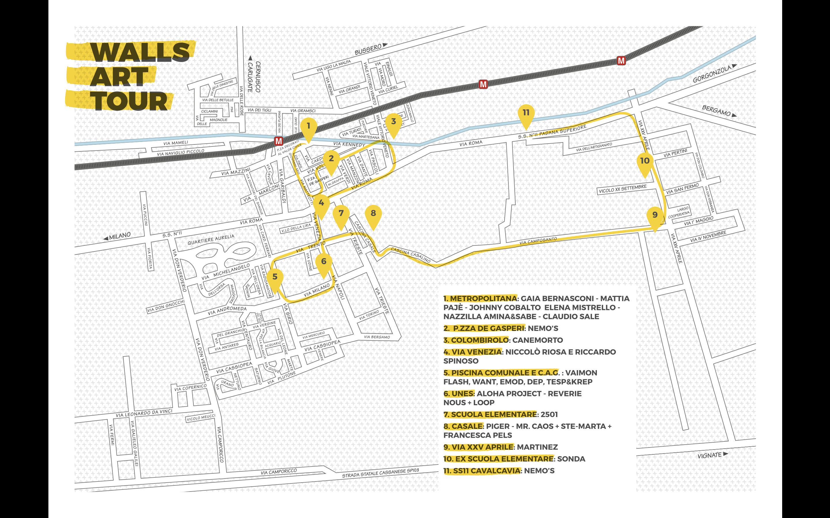 Dopo una fase di mappatura dei muri pubblici grigi e degradati della città, sono stati contattati dai membri dello staff, che lavorano da anni nel mondo dell’arte e del design, gli artisti che hanno accettato di mettere la propria creatività a disposizione dei cittadini di Cassina. Quelli scelti sono street artist molto conosciuti nell’ambiente, come Martina Merlini, Nemo’s, Canemorto, Sonda’s, e anche 2051, l’autore dell’opera sul muro della scuola elementare di piazza Unità d’Italia che ha fatto tanto parlare di sé negli ultimi tempi. Ma non solo, perché i nomi noti saranno affiancati da artisti locali come vmd70’s o Vaimon, un ragazzo di Cassina autore delle saracinesche di alcuni commercianti del paese.