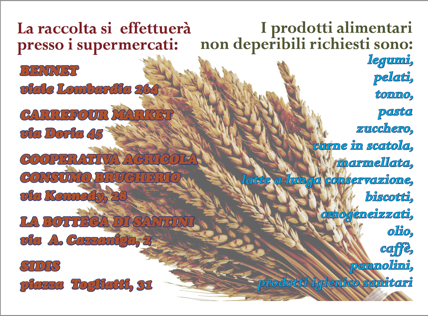 Sabato 13 giugno, dalle ore 9.o0 alle 19.00, i cittadini del comune di Brugherio sono invitati a partecipare alla raccolta aimentare lanciata dal Tavolo delle Associazioni per aiutate le famiglie in difficoltà economiche. L’evento avrà luogo nei supermercati Bennet, la Coop.Agricola Consumo Brugherio, Santini e Sidis.