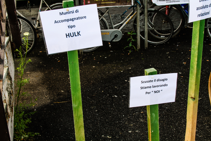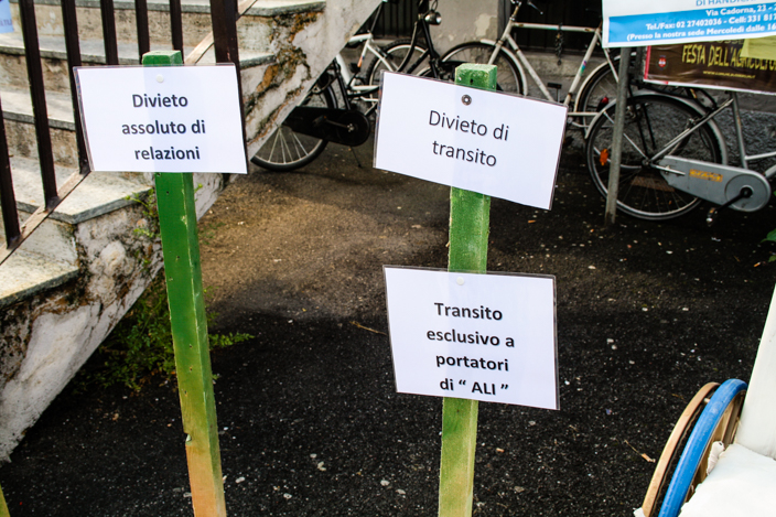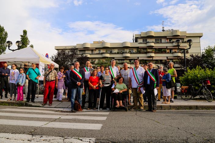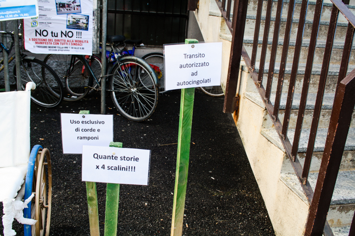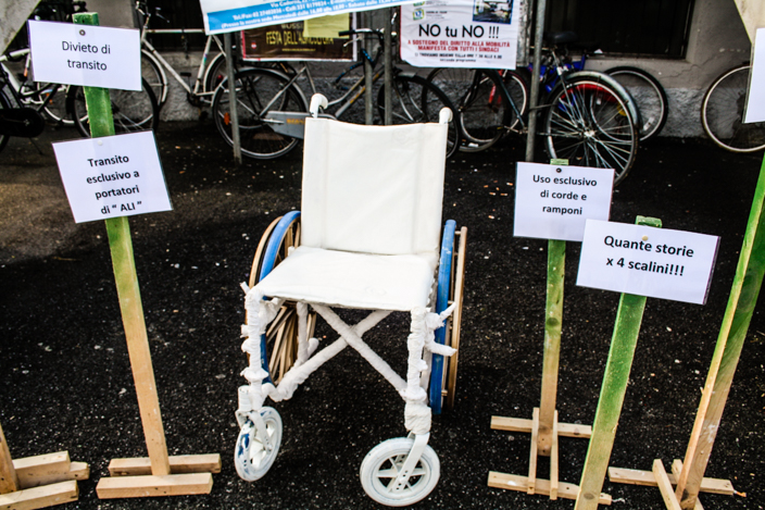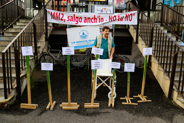 Una curiosa installazione artistica posta all’ingresso della stazione, ha catturato l’attenzione dei presenti: una sedia a rotelle dietro a barriere di legno con cartelli provocatori. “E’ un’installazione che ho creato ed esposto tempo fa ad una mostra ad Inzago -ha raccontato Diego De Crescenzo, artista locale Presidente dell’Associazione Arte Tra La Gentein quel caso parlavamo di ogni tipo di barriere, e questa volta abbiamo voluto lasciare un simbolo esplicito dell’arte che si unisce alla protesta specifica.”