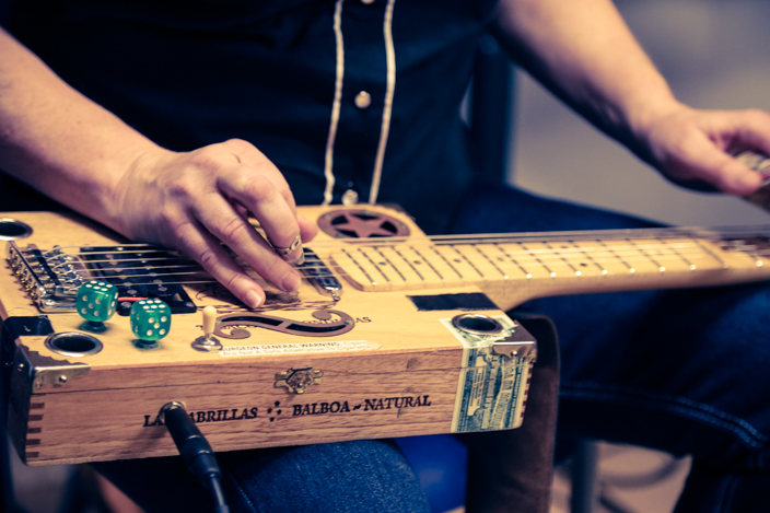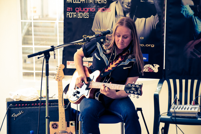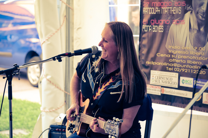 La cantautrice e blues-woman australiana, ma adottata dal mondo del grande blues americano (qui), si è esibita con pezzi di pregiata fattura, esaltando le sue qualità vocali e trascinando il pubblico con un sorriso e una vitalità molto particolari. Al termine dello spettacolo, Fiona Boyes si è poi intrattenuta con molti dei presenti spiegando loro l’origine di una curiosa chitarra con cui si è presentata sul palco, ricavata da una scatola di sigari e modificata con oggetti legati a ricordi personali. “Incredibile -ha commentato un signore di Cernusco – mi ero informato su internet guardando dei video, ma dal vivo mi è sembrata ancora più brava”.