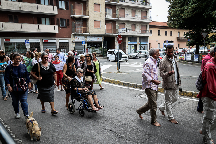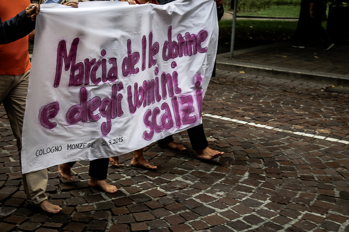 La versione colognese della marcia delle Donne e degli Uomini scalzi, ha lasciato piazza XI Febbraio verso le 16.15 per un corteo che ha attraversato l’isola pedonale, per passare poi davanti al comune, alla chiesa di San Marco e all’oratorio, ritornando in piazza. Decine le persone scalze che hanno aderito, e che prima del corteo si sono ritrovate per un momento di riflessione aperto dal consigliere comunale PD Giovanni Cocciro, che ha letto l’appello firmato da esponenti del mondo culturale, giornalistico, artistico italiano, per sensibilizzare sulla situazione di emergenza umana che tocca la vicenda dei profughi e migranti all’interno dei confini europei. “Dire sì alla vita, dire no alla morte e alla disperazione“. E’ questo il semplice concetto più volte ribadito dallo stesso Cocciro.