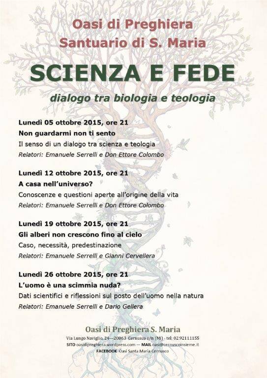 Queste sono le parole con cui un responsabile dell’ Oasi di Preghiera Santa Maria di Cernusco, ha spiegato il senso di un ciclo di incontri-conferenze che terrà banco per tutto il mese di ottobre, e che metterà sul tavolo della discussione il complesso rapporto tra Scienza e Fede, nel dettaglio tra Biologia e Teologia.