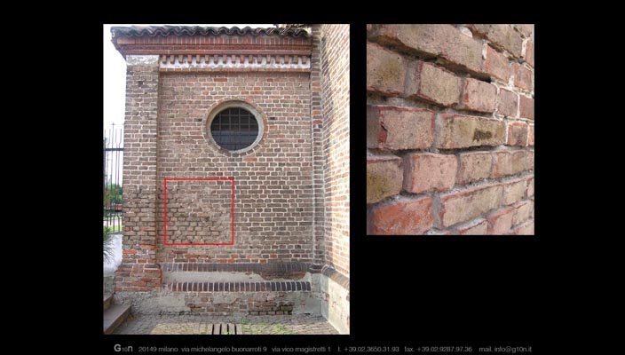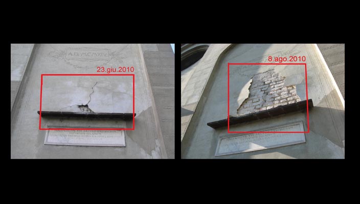 Qui sotto alcune immagini fornite dall’ Architetto Gio Novelli, che illustrano come già nel 2010 a distanza di pochi mesi la situazione andasse peggiorando rapidamente nella facciata esterna (foto 1), così come testimoniano l’umidità di risalita che non sfoga nella parte bassa mentre va a intaccare gli affreschi (foto 2). In ultimo un’immagine che mostra i precedenti interventi tampone (foto 3)