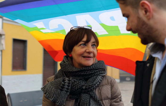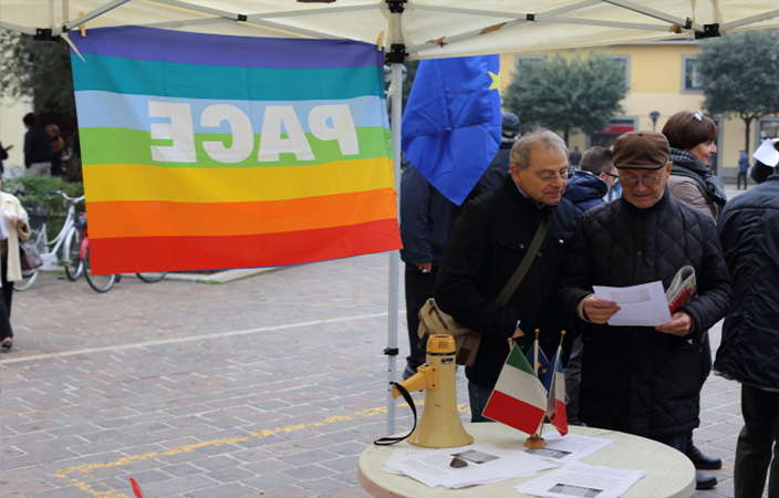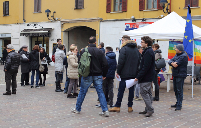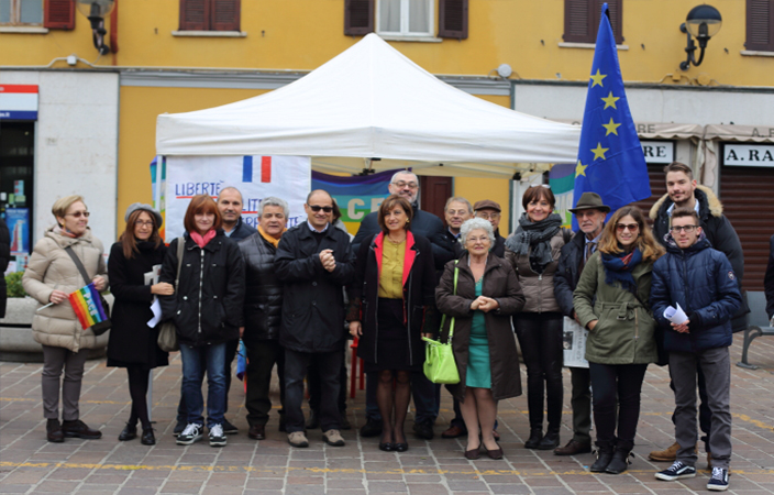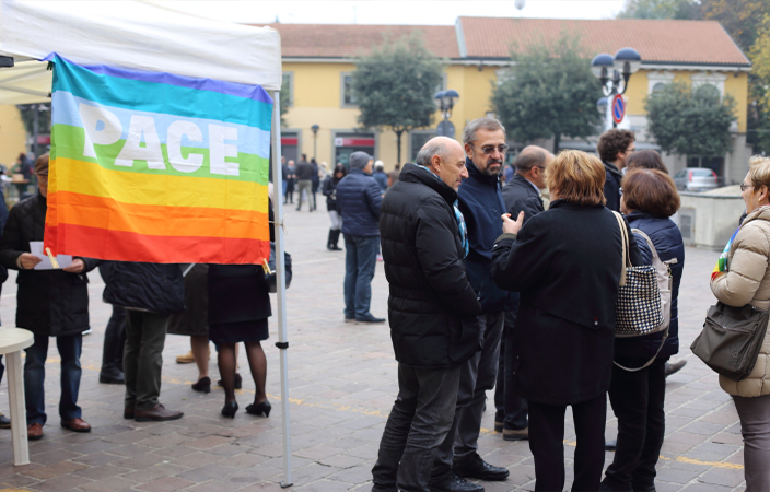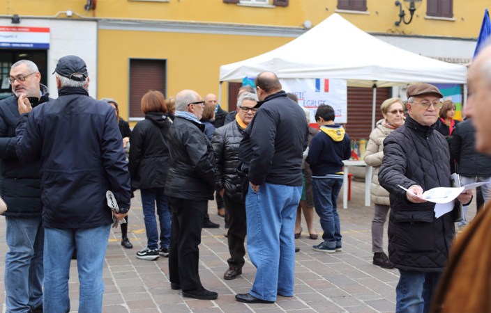 Domenica mattina 15 novembre, un gruppo di cittadini si è riunito spontaneamente in Piazza Roma, seguendo un invito arrivato tramite Facebook sul gruppo cittadino. Un piccolo raduno con bandiere della Pace, bandiera Europea listata a lutto, un tricolore francese e “le storiche bandierine di quando fu siglato il gemellaggio con il paese francese di Le Puy En Velay“, come ha spiegato una donna al banchetto. Un gruppo di persone che si sono ritrovate a discutere di ciò che era successo, ribadendo la loro vicinanza al popolo parigino colpito dagli attentati. “Ci sarà il tempo per le valutazioni e le discussioni -si legge nel volantino distribuito- ora è il tempo della solidarietà. […] Manifestiamo come cittadini italiani ed europei, manifestiamo come esseri umani. Manifestiamo perché la barbarie va combattuta, sempre, a Parigi come in Siria, Iraq, ovunque innocenti confino a morire”. E al capannello di cittadini accorsi al gazebo, tra cui diversi giovani, si sono aggiunti intorno alle 11.00, anche gli Assessori Valli e Maino e numerose persone uscite dalla Messa domenicale.