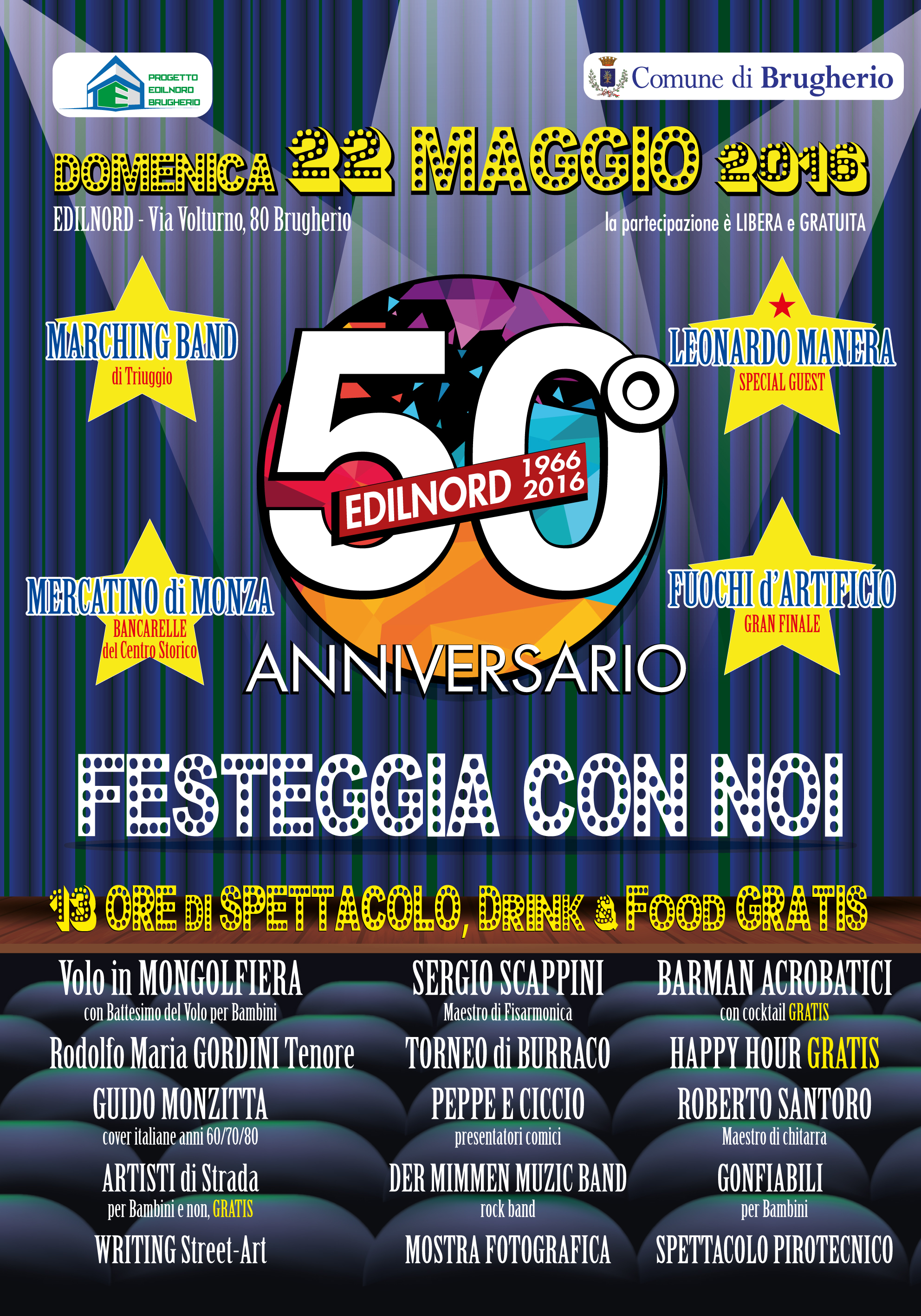 In questi cinque decenni la realtà è cambiata molto e oggi il quartiere è pronto a celebrare un traguardo importante con «Una grande festa non solo per l’Edilnord, ma per tutta Brugherio», come precisato da Gaetano Garramone, presidente dell’associazione Progetto Edilnord, che si sta occupando dell’organizzazione dell’evento. Si comincia alle ore 9.00 di domenica 22 presso il centro di via Volturno 80, con l’apertura delle bancarelle e l’inaugurazione di una mostra fotografica sui cambiamenti del quartiere. In mattinata sono in programma spettacoli e gonfiabili per bambini, esibizioni di street art e un torneo di burraco di beneficienza. Nel pomeriggio invece sono in programma voli in mongolfiera, musica e spettacoli, con la speciale partecipazione di Leonardo Manera, noto comico di Zelig e Colorado Cafè. Per chiudere la giornata di festa ci sarà un aperitivo in compagnia alle ore 18.00 e spettacoli pirotecnici in serata.