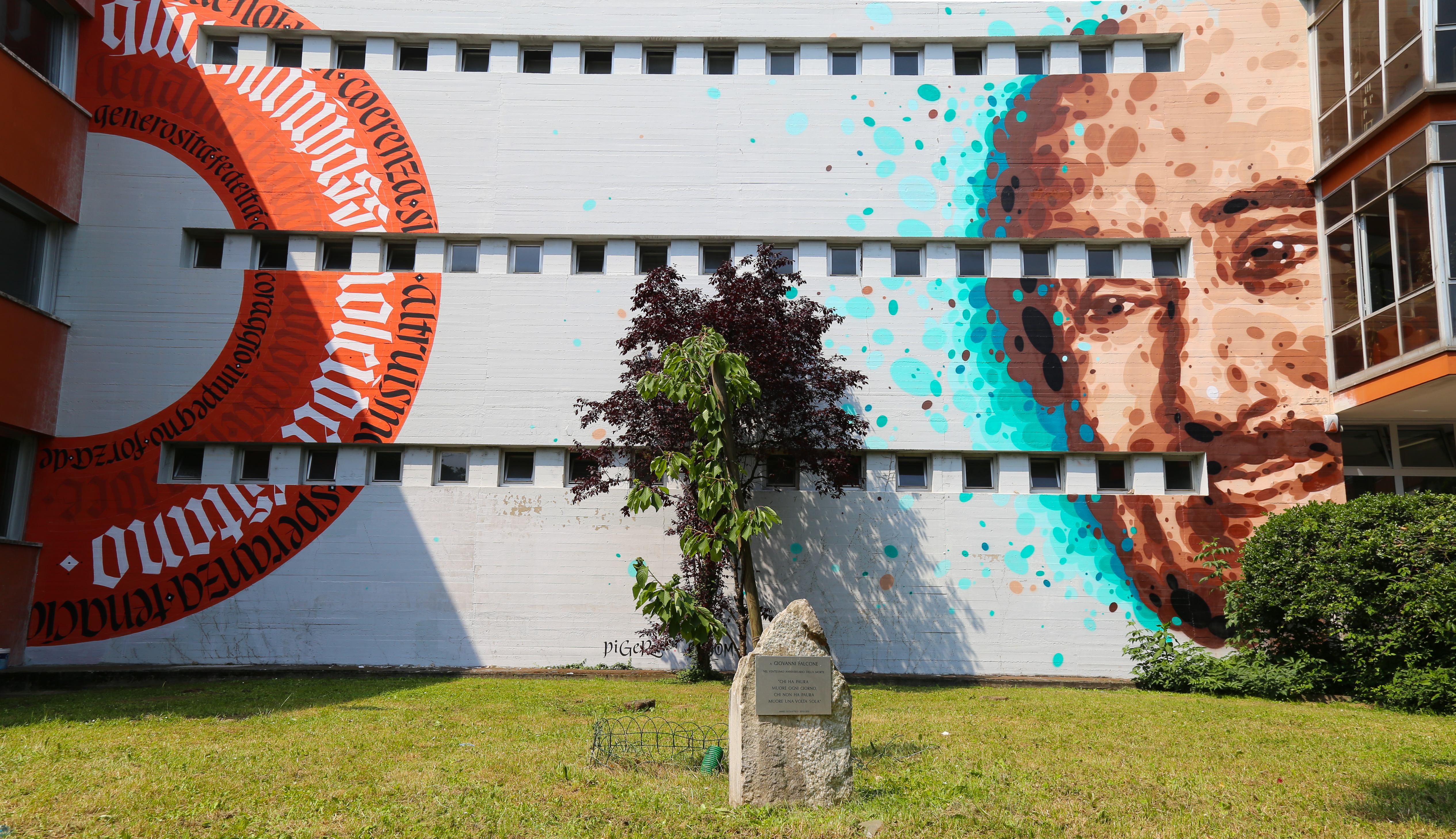 La scuola media Giovanni Falcone di Cassina, ha una storia davvero particolare nella sua intitolazione, e il grande murales che ora ne adorna una