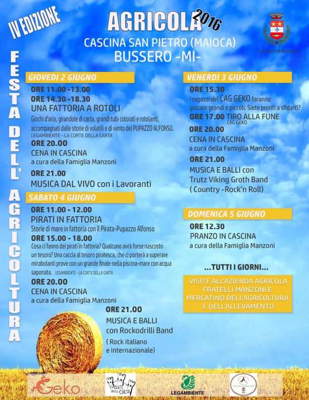 Anche quest’anno, l’amministrazione comunale, ripropone per la quarta volta questo evento davvero attesissimo da tutti i cittadini. Cinque giorni, da giovedi’ 2 giugno a domenica 5 giungo, sempre a Cascina San Pietro (Maioca), in cui si potranno condividere momenti di allegria tra i campi e le cascine del territorio.
