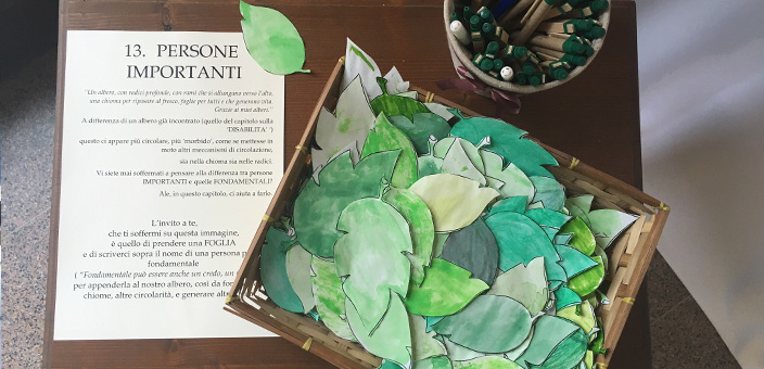 “La scrittura per Alessandro non è stata solo un modo per iniziare a comunicare, ma è stata effettivamente una cura che lo ha portato a stare bene, fisicamente, a livello relazionale, nella quotidianità della vita al centro -ha spiegato Roberta Sirtori, educatrice della Cooperativa Il sorriso e curatrice dell’esposizione insieme a Virna Tremolada, anche lei educatrice del centro- Questa esposizione non è un voler spiegare semplicemente il contenuto del libro, che è di per sé immediato, abbiamo pensato invece di prendere singoli capitoli e lavorarli con gli altri utenti della Cooperativa, che in base alle proprie capacità e peculiarità, hanno contribuito alla realizzazione di queste installazioni, prendendo una parola, un concetto, e dandone la propria visione. E’ un progetto un po’ ambizioso e alto, per uscire da quello schema secondo cui la disabilità si ferma alla possibilità di fare disegnini o lavoretti“.