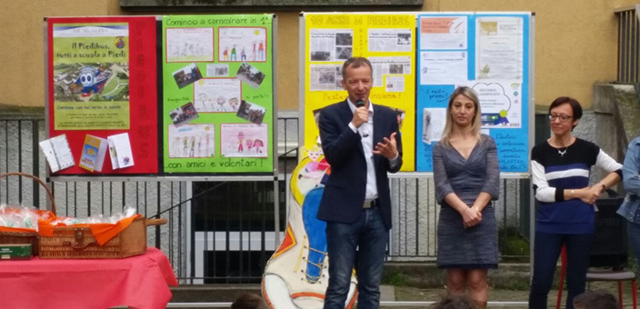 Proprio per questo il sindaco Eugenio Comincini e la dirigente scolastica Annalisa Sivieri, hanno voluto festeggiare questo anniversario con un breve momento celebrativo poco prima dell’ingresso degli alunni. “Il piedibus è una realtà speciale di Cernusco – ha dichiarato Comincini – perchè coinvolge molti alunni ma anche molti volontari che ogni giorno rendono possibile tutto questo. È un’esperienza educativa importante in cui si coniugano salute, ecologia e risparmio.”