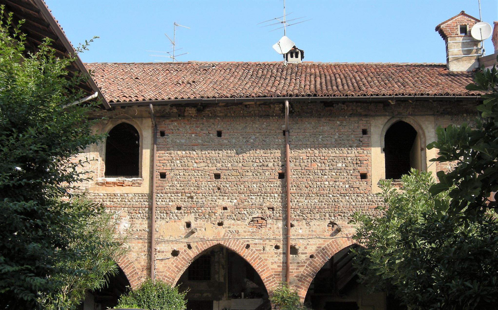 Dopo aver superato con un ponte canale il torrente Molgora che scorre sotto il Naviglio, arriviamo ad un semaforo, qui abbandoniamo la ciclabile e attraversiamo il ponte di via Milano che conduce nel centro storico di Gorgonzola. In via Italia, dopo il Municipio, svoltiamo a sinistra in via Montegrappa, in fondo ci appare la facciata del Santuario di Santa Maria dell’Aiuto, una chiesa del XV secolo che un tempo apparteneva al vicino convento delle Umiliate. Possiamo trovare altre tracce del convento entrando nella Corte dei Ciosi (foto sopra), in via Piave 12. In fondo al cortile scorgiamo un inatteso e pittoresco angolo dell’antico chiostro costruito in ciottoli di fiume e cotto. L’edificio risalente al XIII secolo è aperto in basso da quattro archi ogivali sorretti da solidi pilasti in mattoni. Via Piave è a senso unico e senza pista ciclabile, procediamo quindi con bici a mano fino a via IV Novembre dove sopra l’ingresso di un cortile campeggia la scritta “Latteria sociale Gorgonzola” (foto sotto). La scritta è sbiadita, ma il ricordo della tradizione casearia che ha reso celebre il nome di Gorgonzola in tutto il mondo è ancora vivo. Una tradizione che, ogni anno il terzo fine settimana di settembre, rivive nella Sagra Nazionale del Gorgonzola (per info: www.prolocogorgonzola.it).