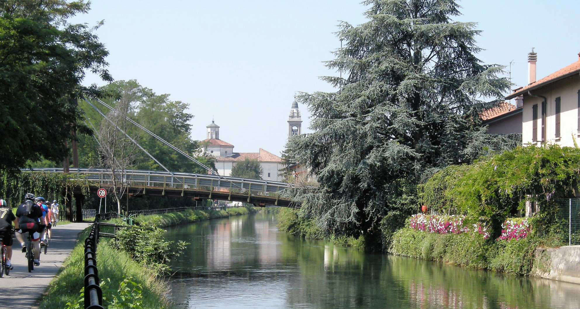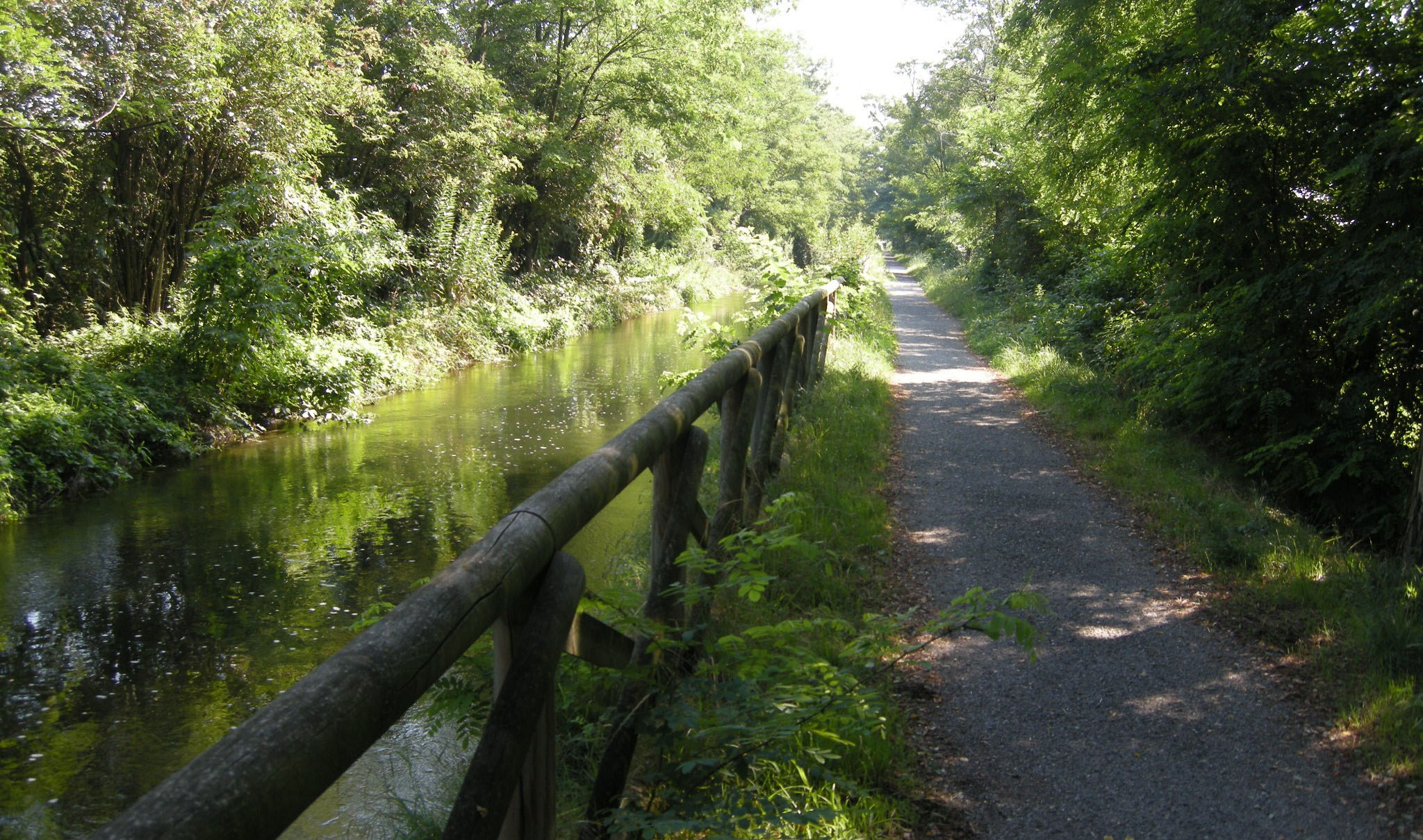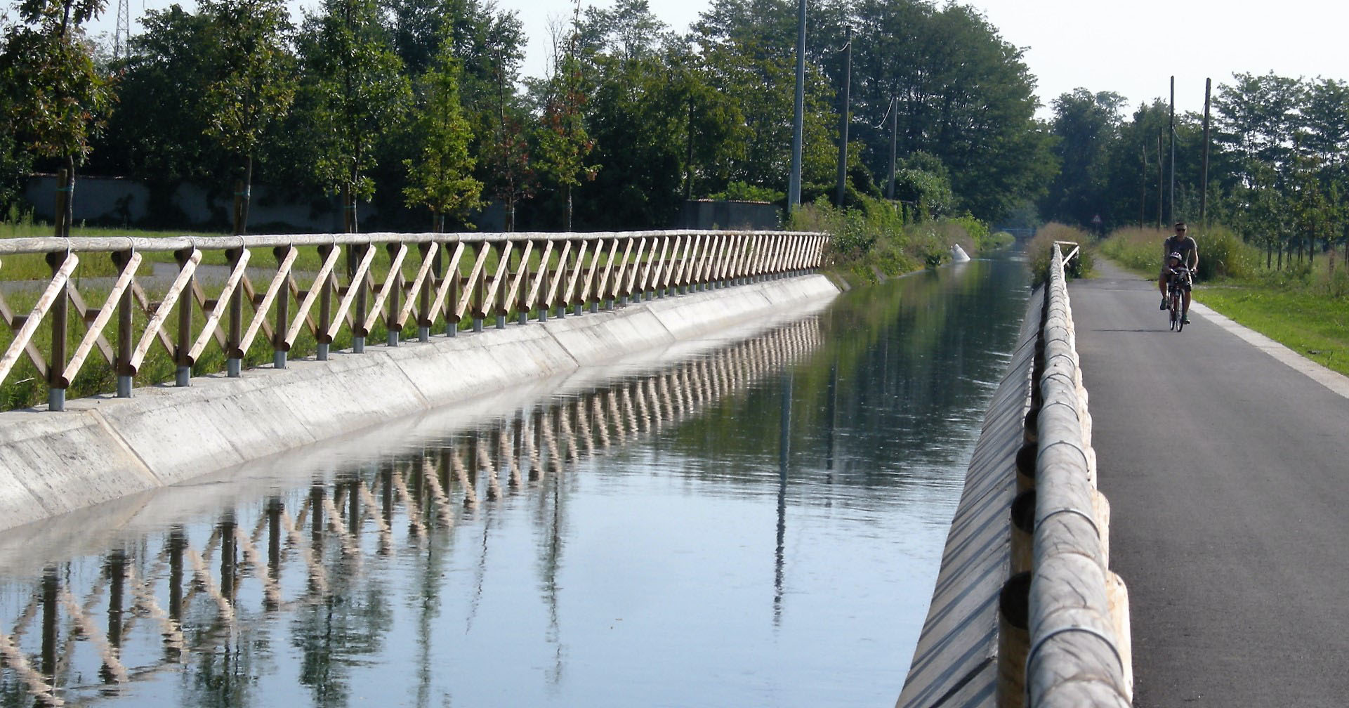 A 10 km esatti dalla partenza, incrociamo il Villoresi, (foto a lato e sotto) il secondo canale artificiale più lungo d’Italia. Prende il nome dall’ingegner Eugenio Villoresi che lo progettò alla fine dell’Ottocento. Osservando una mappa idrografica possiamo notare che tutti i corsi d’acqua che solcano la nostra pianura scorrono da nord verso sud-est, seguendo la naturale inclinazione del suolo. Il Naviglio e il Villoresi invece la attraversano perpendicolarmente, il primo scorre verso ovest portando l’acqua dell’Adda a Milano, mentre il secondo scorre dalla parte opposta portando l’acqua del Ticino verso l’Adda. Entrambi i canali alimentano un’immensa rete di fossi che copre tutta la campagna. Siamo nel cuore di un ciclopico lavoro di ingegneria idraulica che nel corso dei secoli ha modellato il territorio e trasformato la pianura asciutta in fertile pianura irrigua. Forse oggi abbiamo un po’ perso la consapevolezza del valore di questo grande patrimonio e questo itinerario ci invita a riscoprirlo e valorizzarlo, anche turisticamente. Basta leggere le parole che scrisse nel 1844 Carlo Cattaneo in Notizie Naturali e civili su la Lombardia per rendersi conto di quello che abbiamo sotto gli occhi e a volte non vediamo