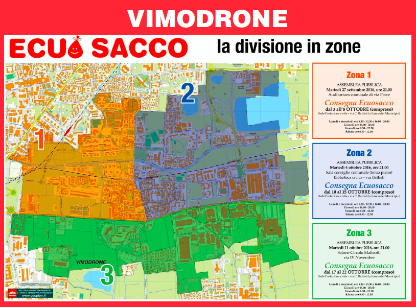 Dunque in ogni abitazione arriverà il numero speciale dell’informatore comunale (oltre a quello già pervenuto prima dell’estate), sul sito del comune vi è una sezione apposita con ogni sorta di informazione e istruzione, e dal 27 settembre partiranno le assemblee rivolte alla cittadinanza, per comodità suddivisa in 3 macro zone (qui i dettagli sulle zone e le date delle assemblee), inoltre durante la giornata di Puliamo il Mondo di domenica 25, verra distribuita un’ulteriore informativa relativa all’ Ecuosacco.