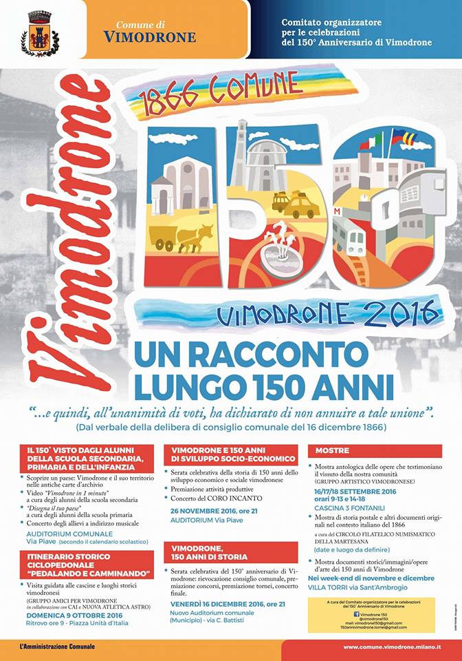 Molti altri sono però gli eventi per i cittadini, che verranno svelati nella brochure consegnata durante la notte XL di sabato 10 settembre (qui), che vedrà anche la spiegazione del Logo del 150° (qui) da parte dell’artista vimodronese, Vincenzo Gornati. “Celebrare i 150 anni trascorsi da quella deliberazione del consiglio comunale –conclude Brescianini- vuol dire riannodare i fili della memoria, diffondere il senso di appartenenza a una storia comune, ma anche di volgere uno sguardo attento al presente, a una comunità che in questi anni è cresciuta ed è cambiata profondamente”.