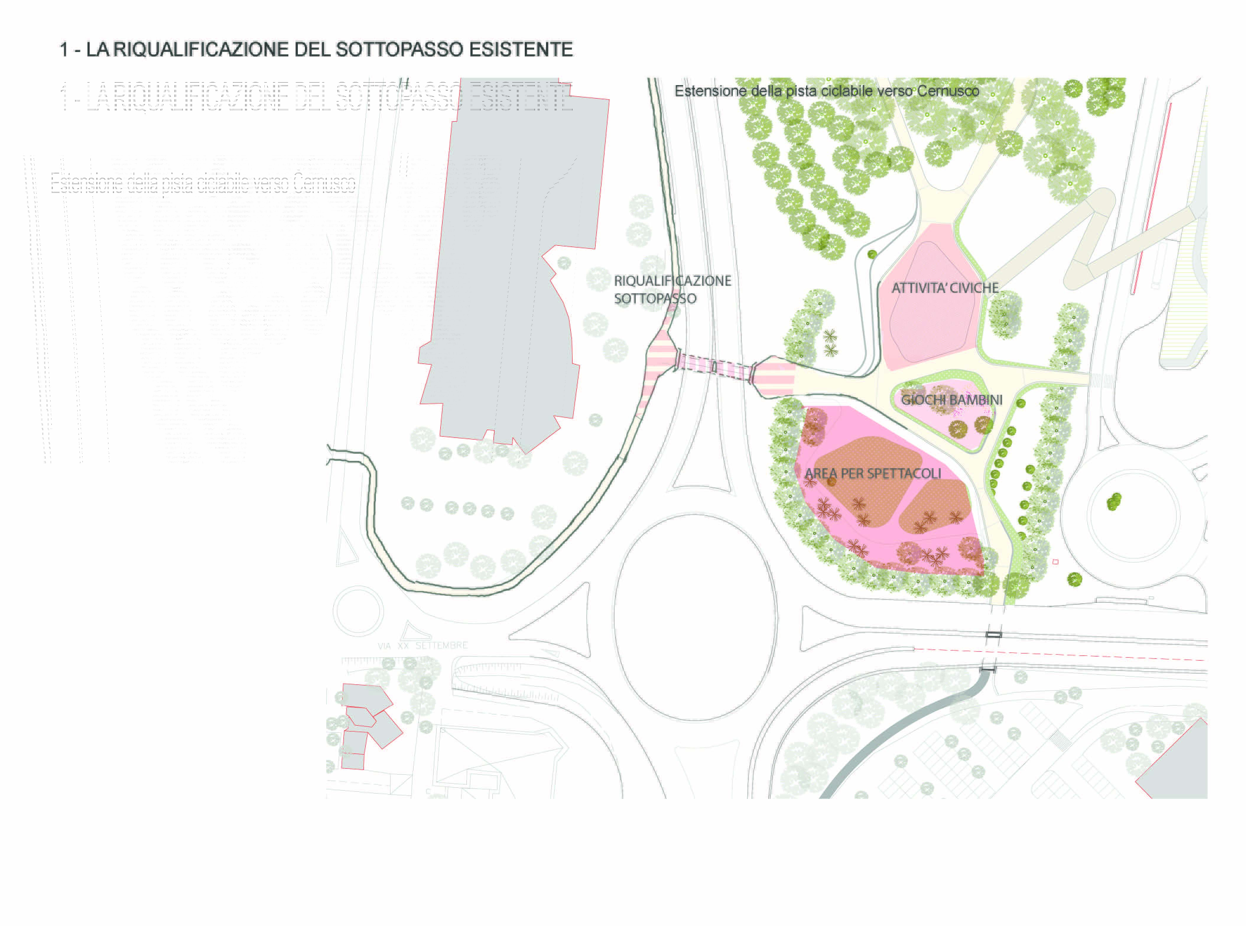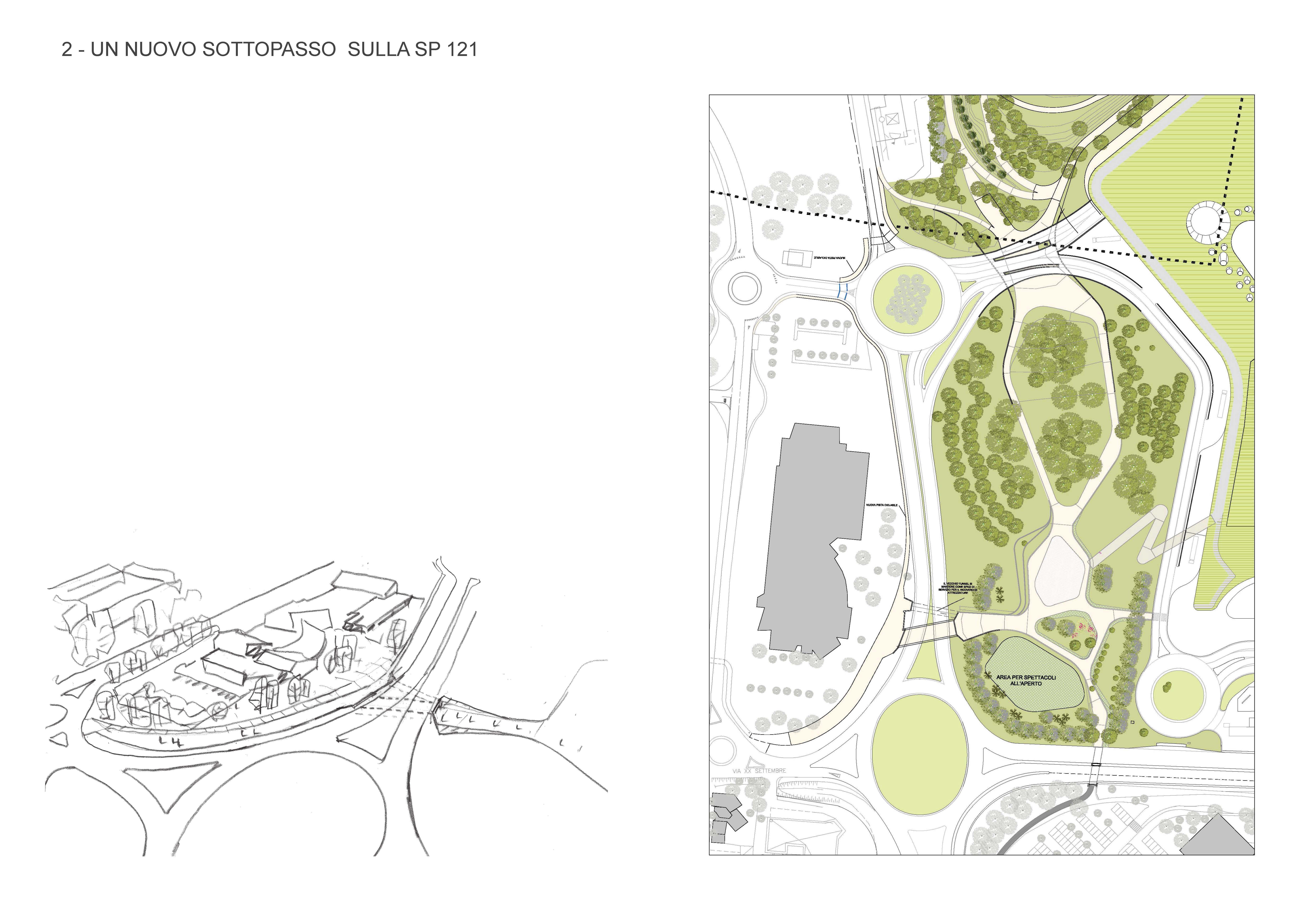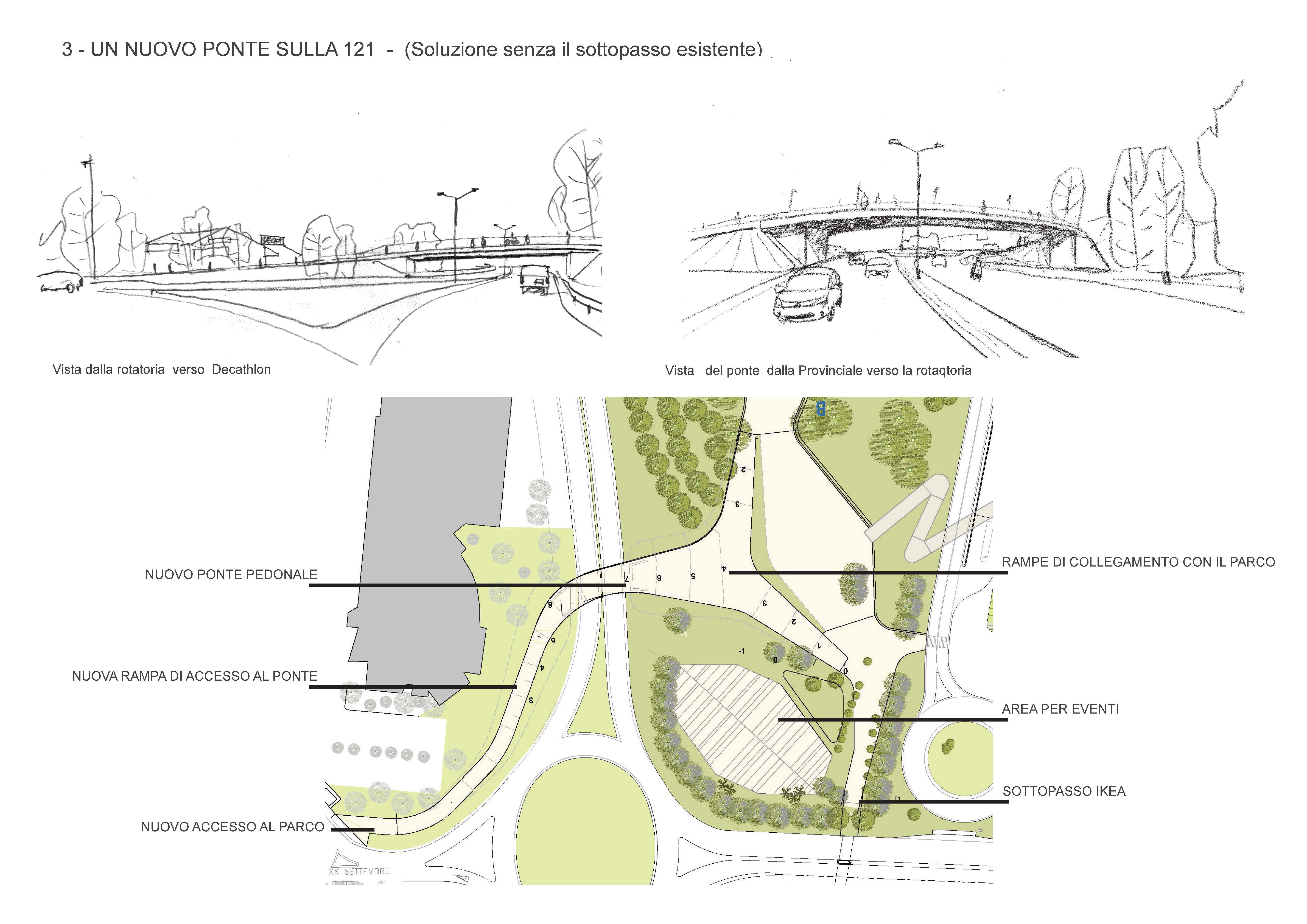 Altra novità rispetto al progetto presentato nella conferenza di maggio, è un congiungimento fra parco comunale adiacente il centro commerciale e città, per cui sono state suggerite 4 tipologie diverse di collegamento che spaziano dalla riqualificazione del sottopasso già esistente (qui), alla sostituzione di quest’ultimo con uno nuovo (qui) o, addirittura, alla costruzione di un passaggio ciclo pedonale sopraelevato, che potrebbe sia sostituire il sottopasso (qui), sia costituire una seconda alternativa ad esso (qui).